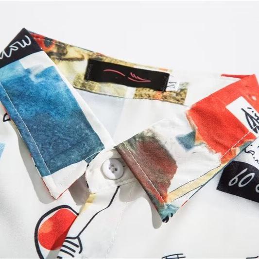 复古美式vintage日系古巴领花衬衫男生短袖夏季港风痞帅字母衬衣