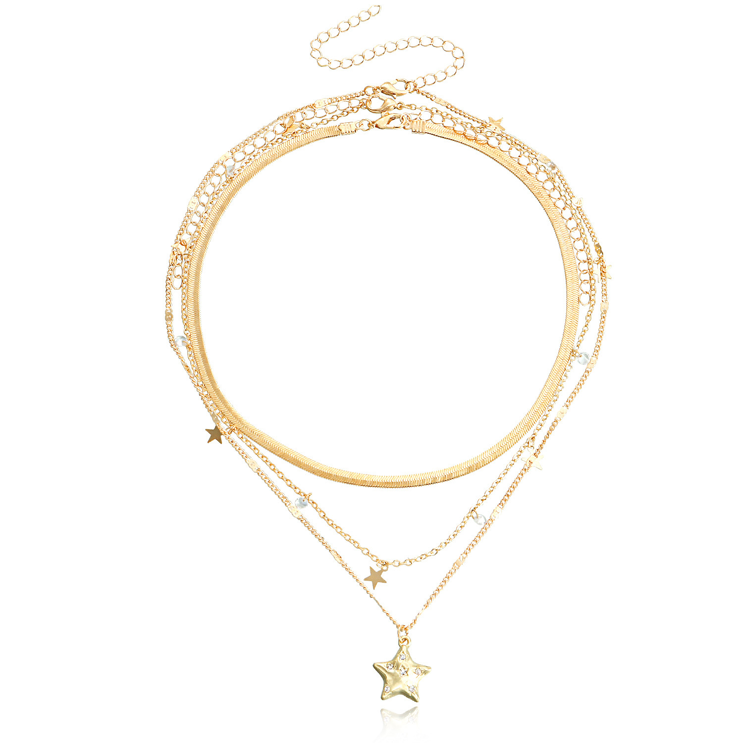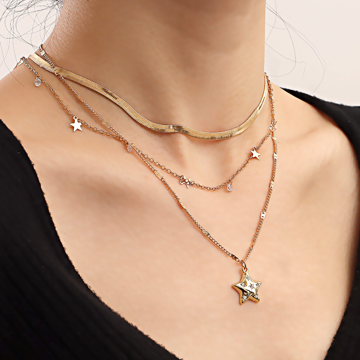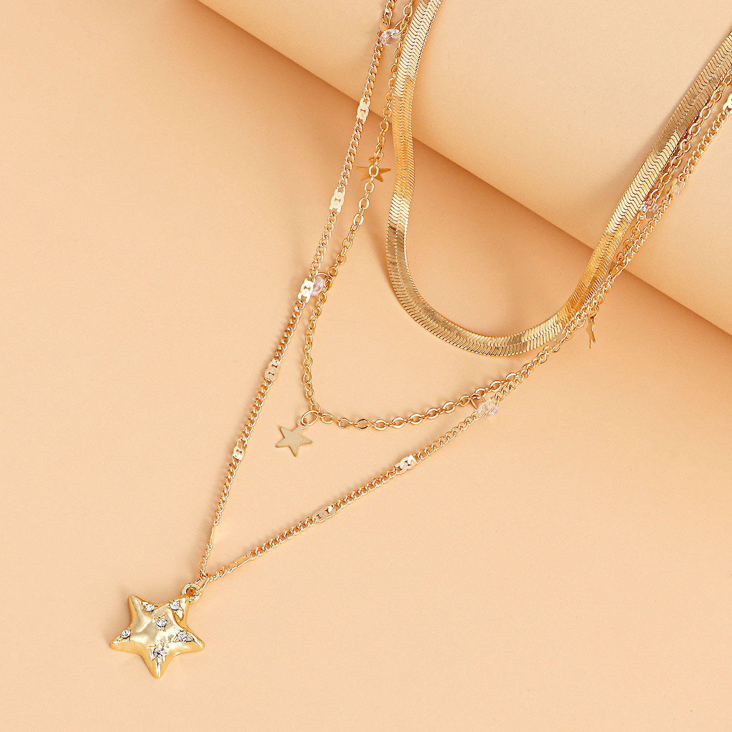 金色五角星吊坠多层项链 简约闪亮锆石坠饰项链女