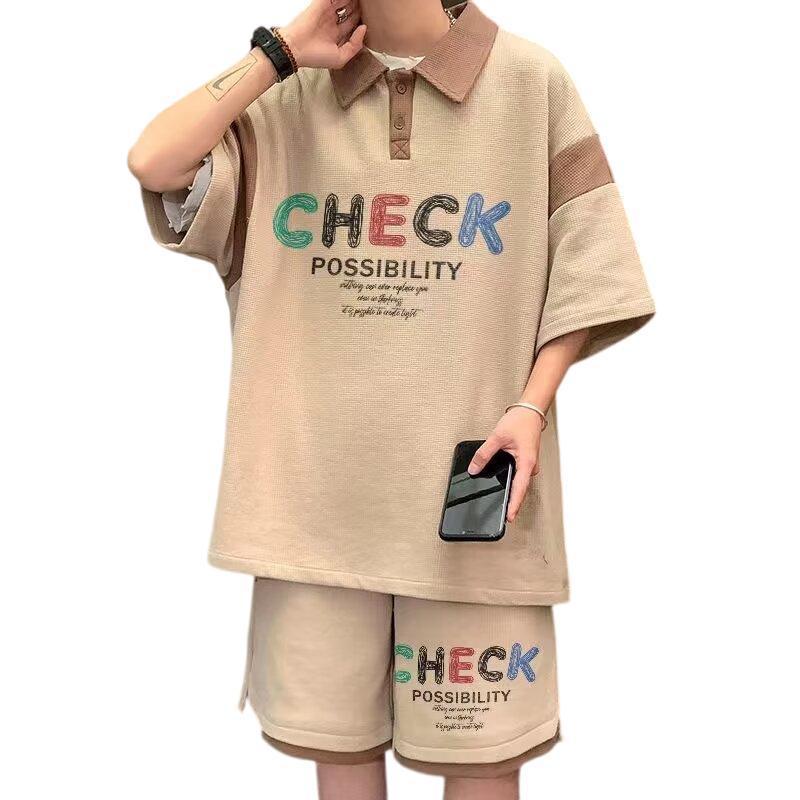 华夫格polo衫男生夏季休闲运动套装字母印花翻领短袖时尚短裤套装