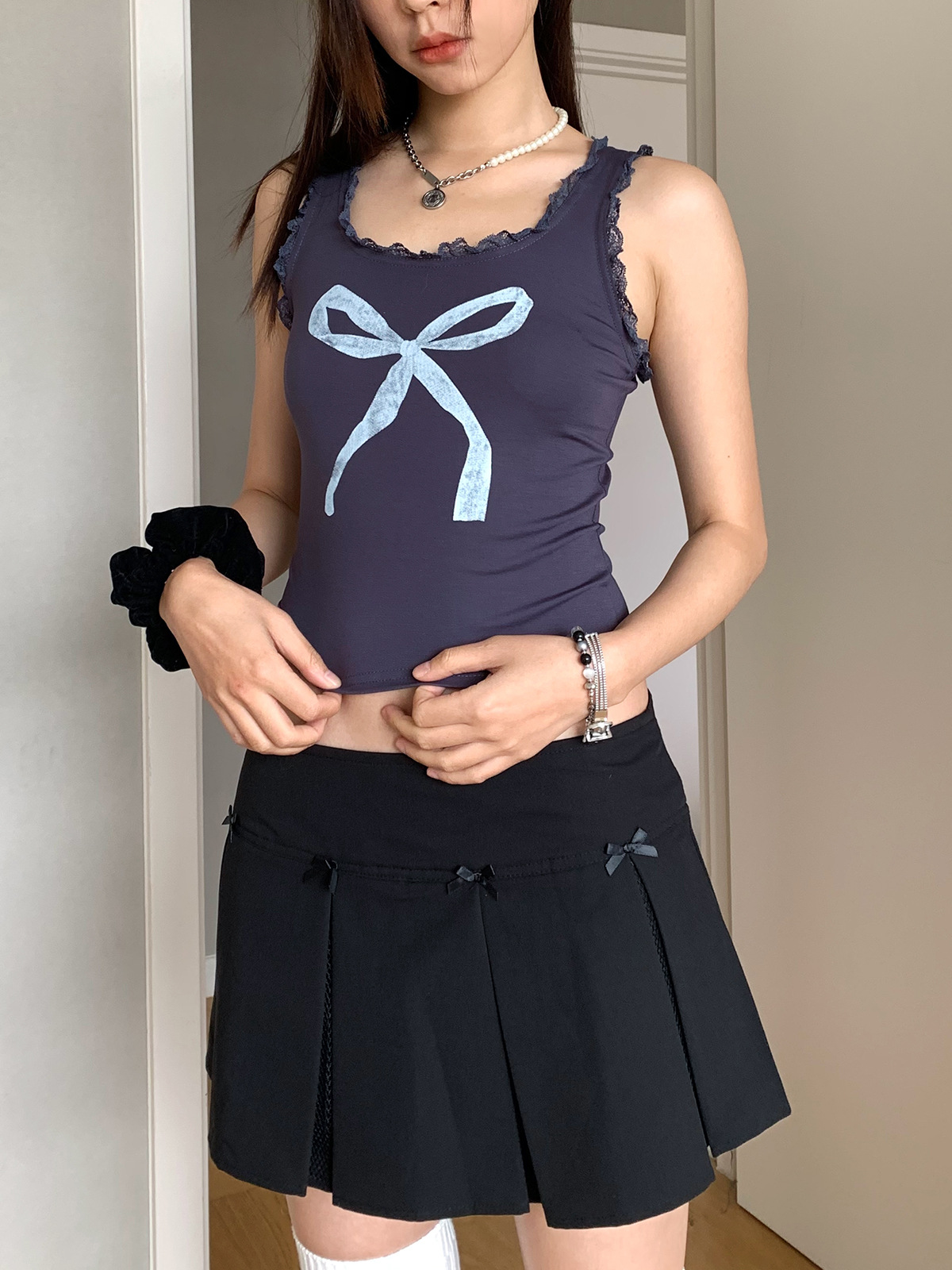 夏季辣妹蕾丝拼接U领背心女蝴蝶结短款印花修身小吊带