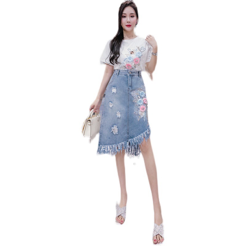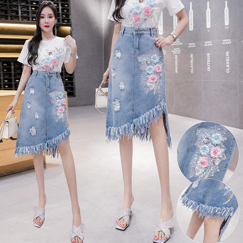 刺绣立体花朵毛边不规则半身裙女夏季新款时尚百搭牛仔中长裙