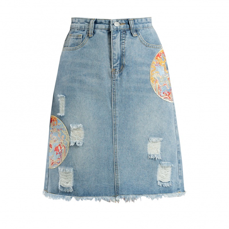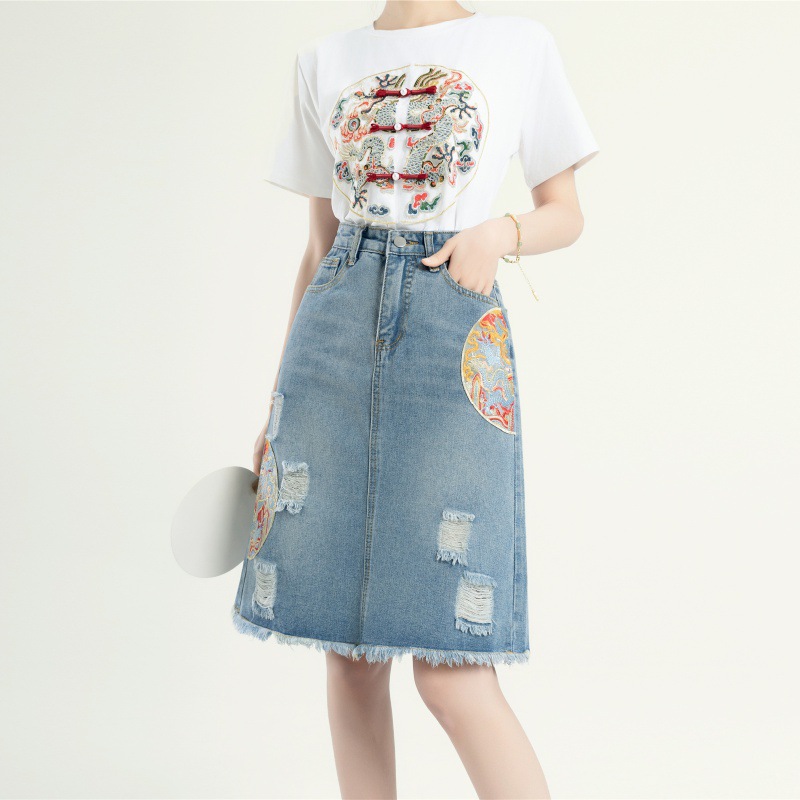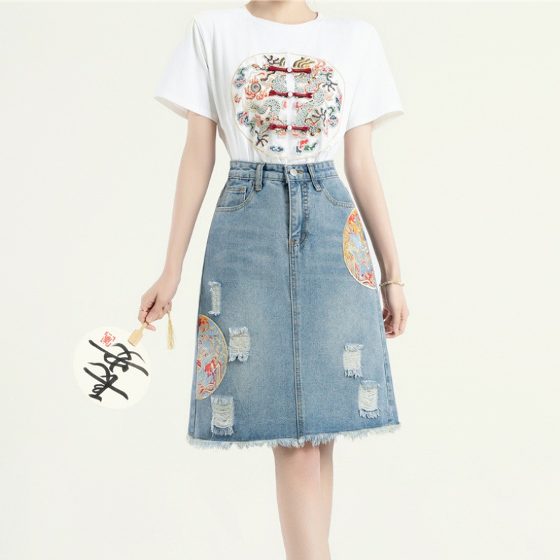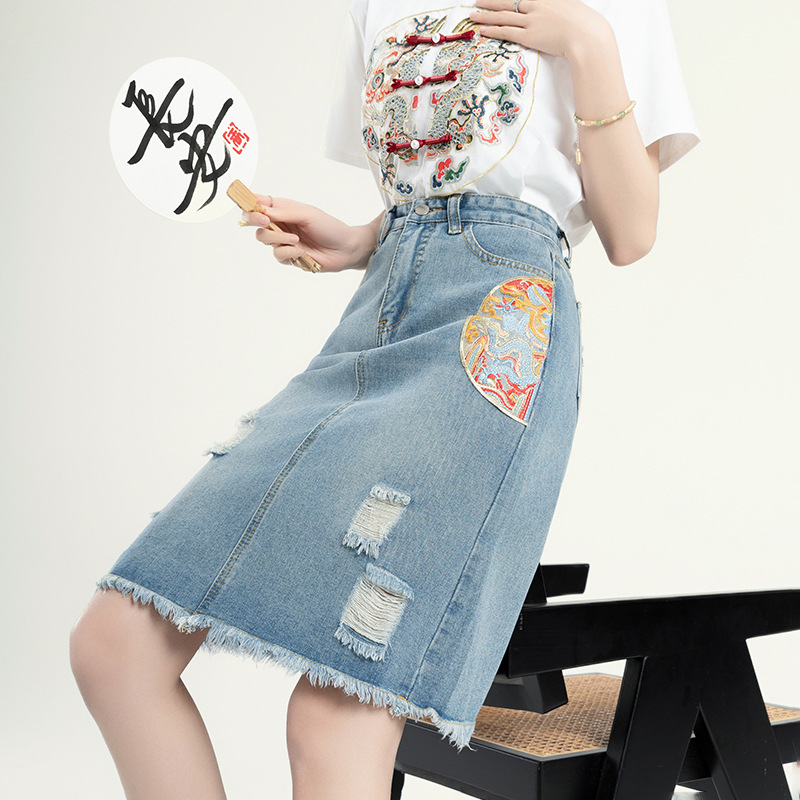 新中式国风牛仔半身裙A字裙女高腰刺绣破洞浅色牛仔裙中长裙女潮