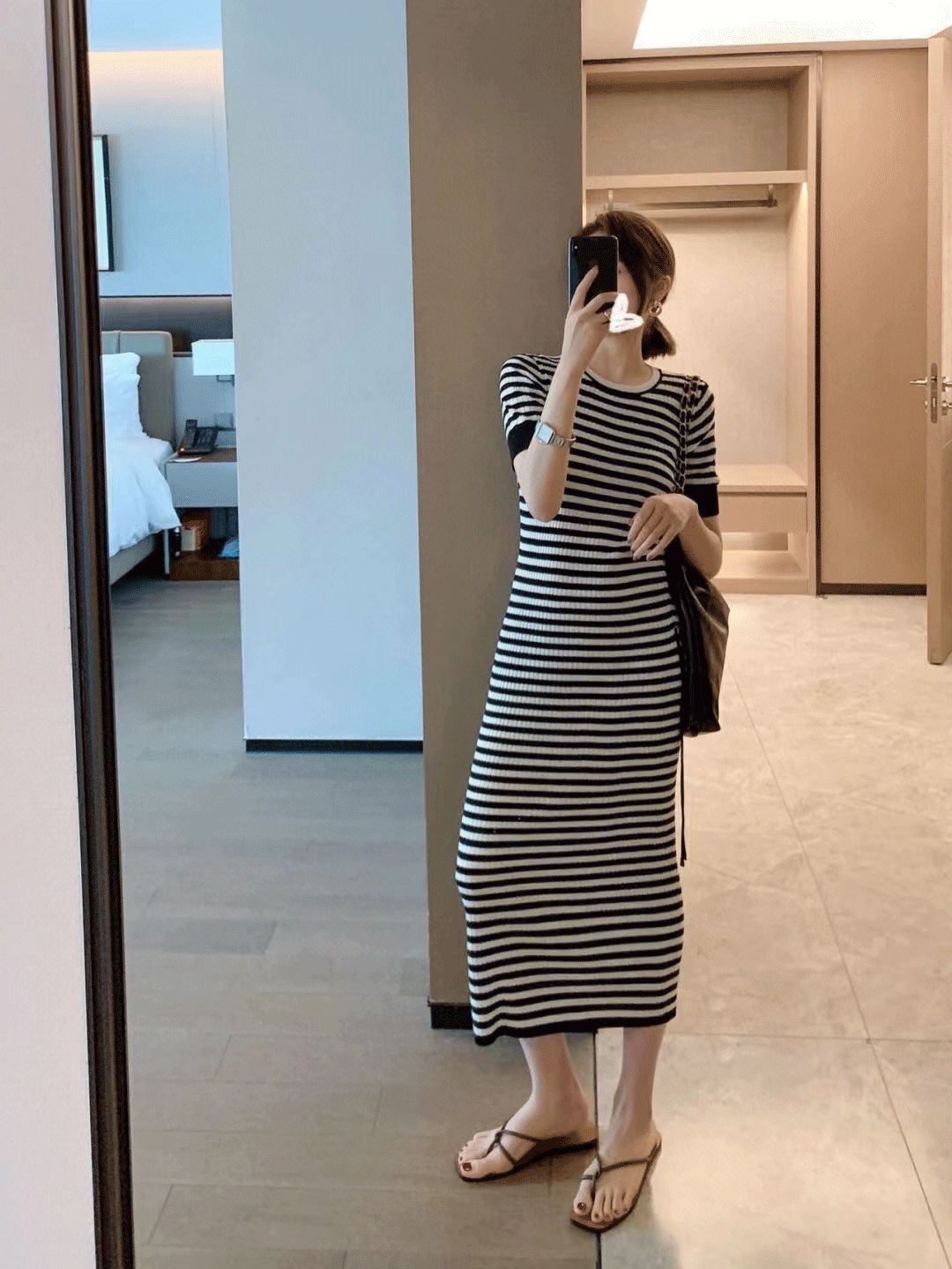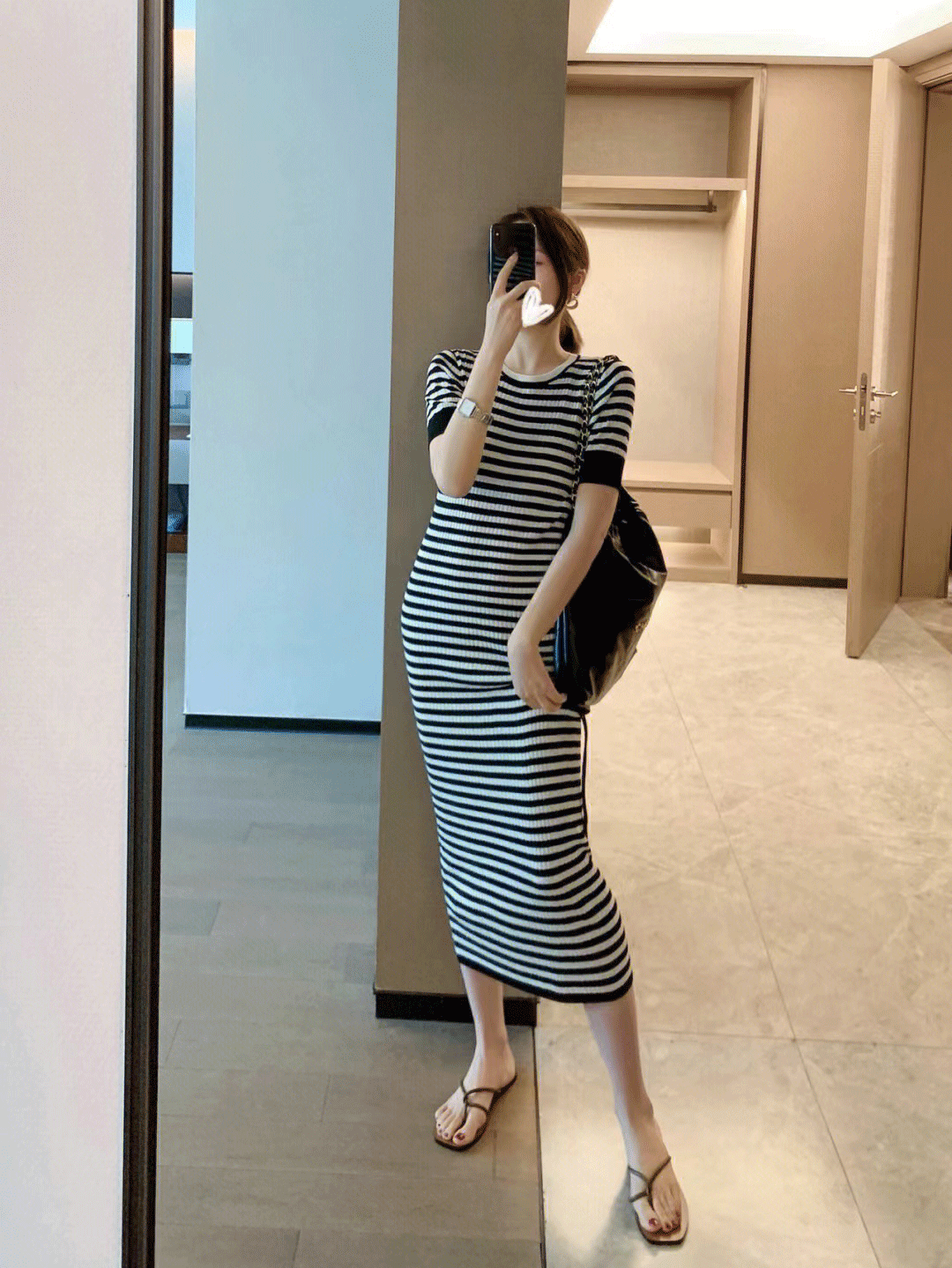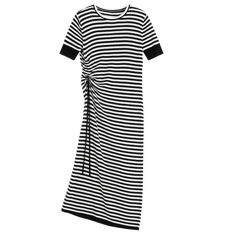 黑白条纹针织连衣裙女夏季新款收腰显瘦气质女神范抽绳长裙女