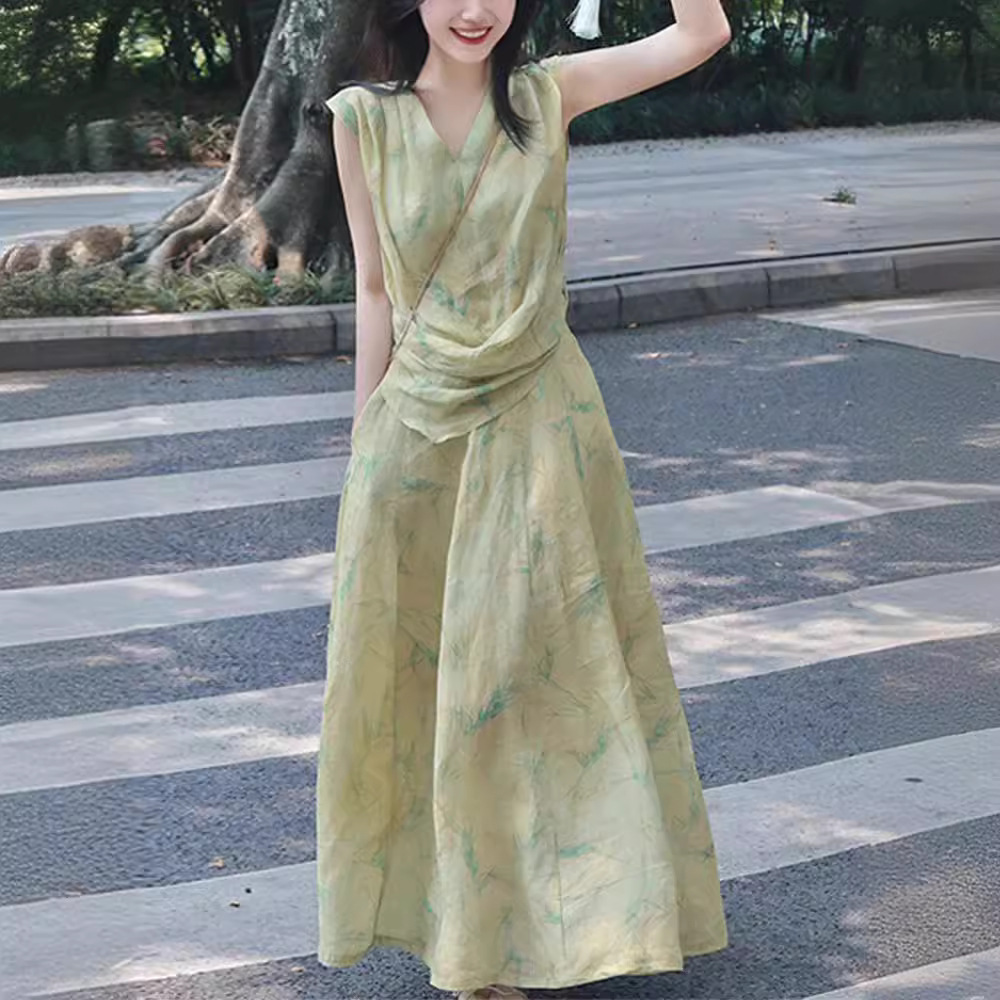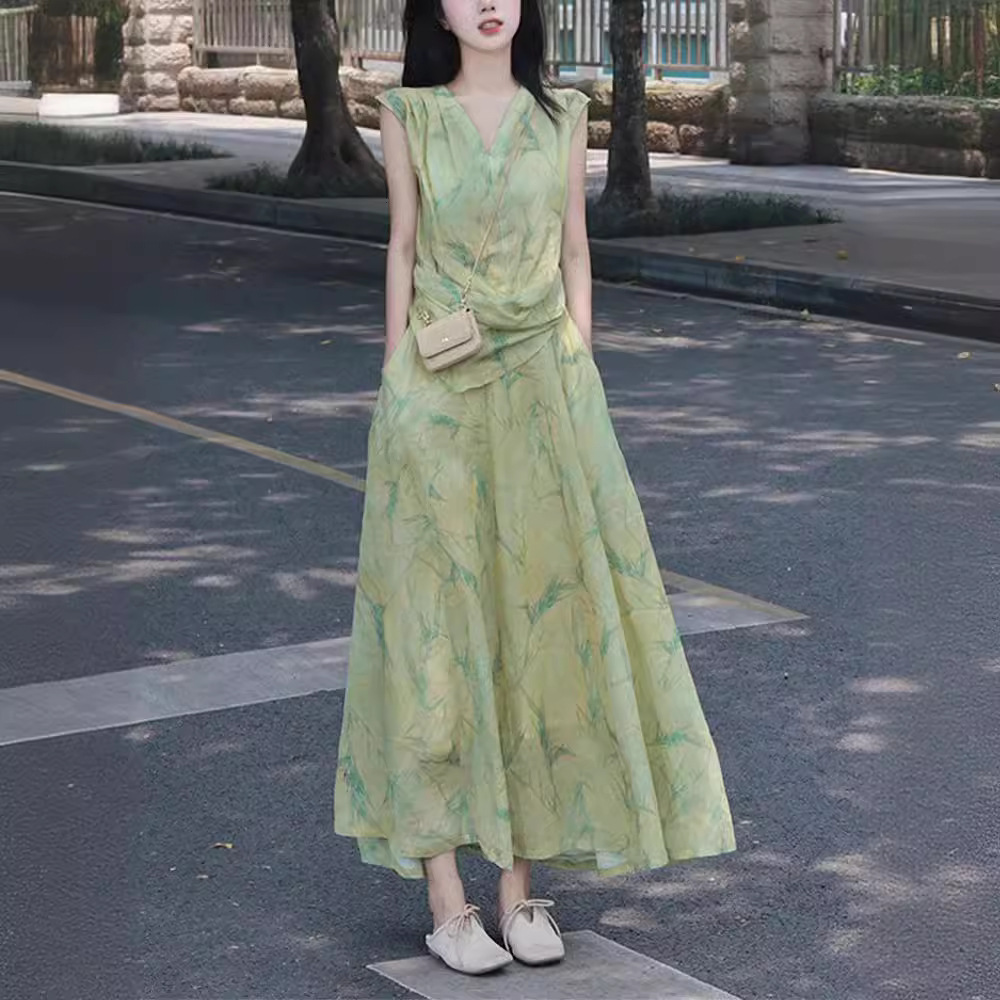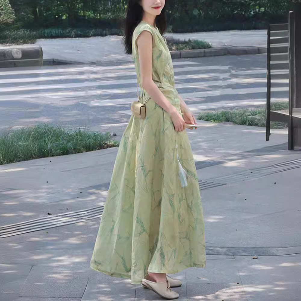 法式轻奢洋气绿色无袖连衣裙夏季新款三亚度假沙滩长款裙子