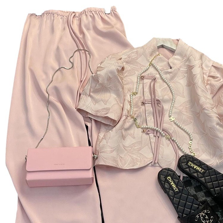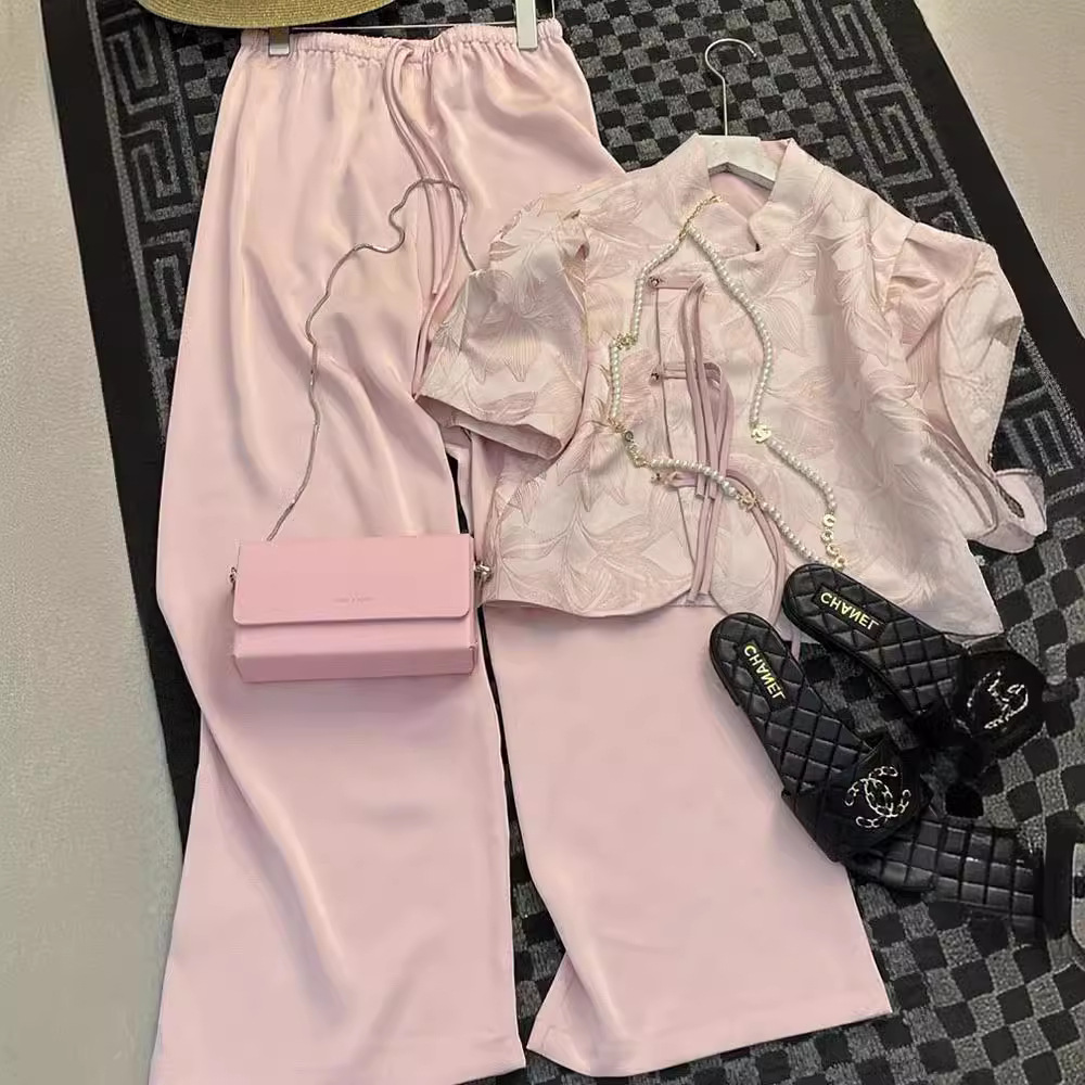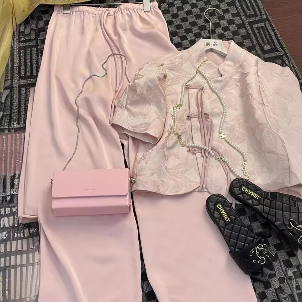 夏季新款新中式国风轻奢清新粉色显瘦盘扣衬衫阔腿裤两件套女