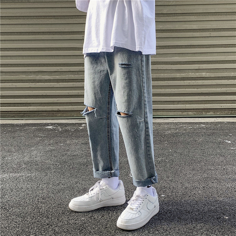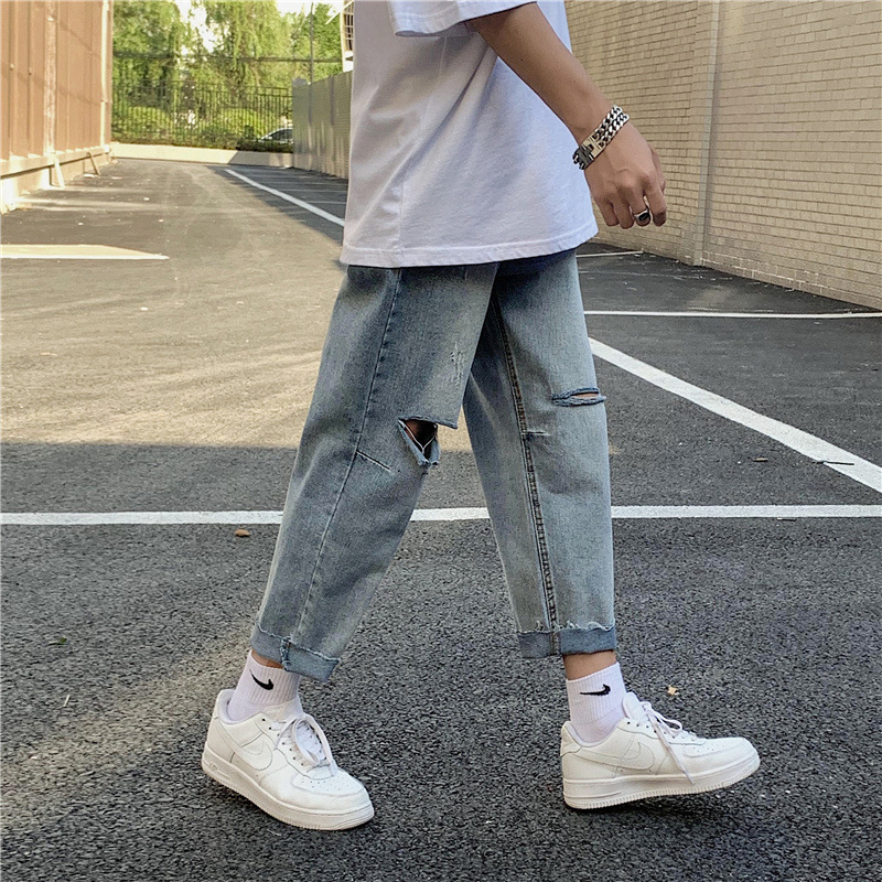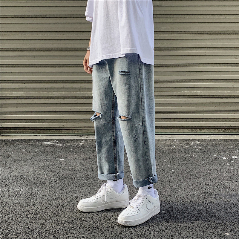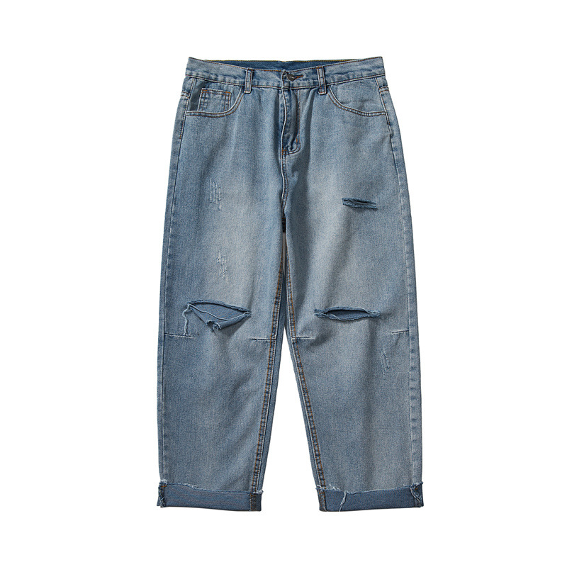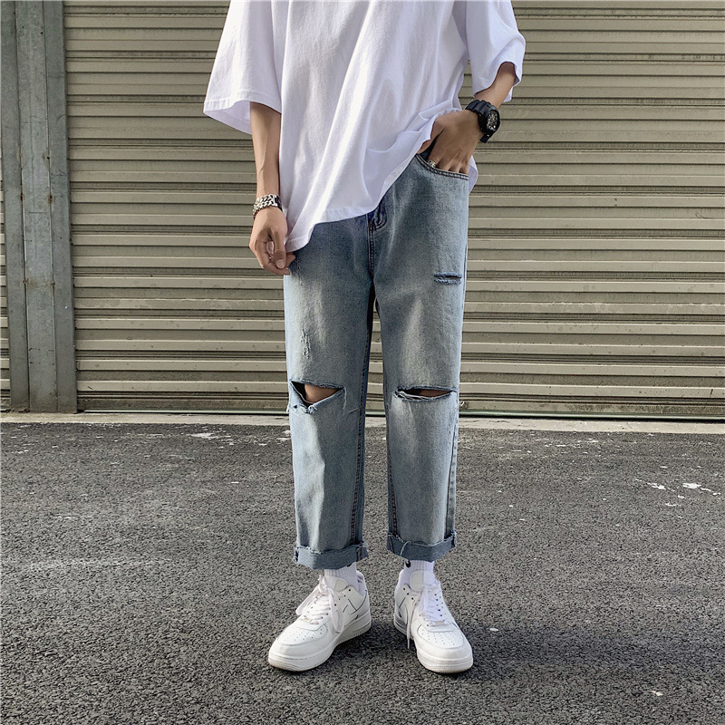 破洞牛仔裤男夏季薄款高街潮牌九分宽松直筒坠感阔腿乞丐刮烂裤子