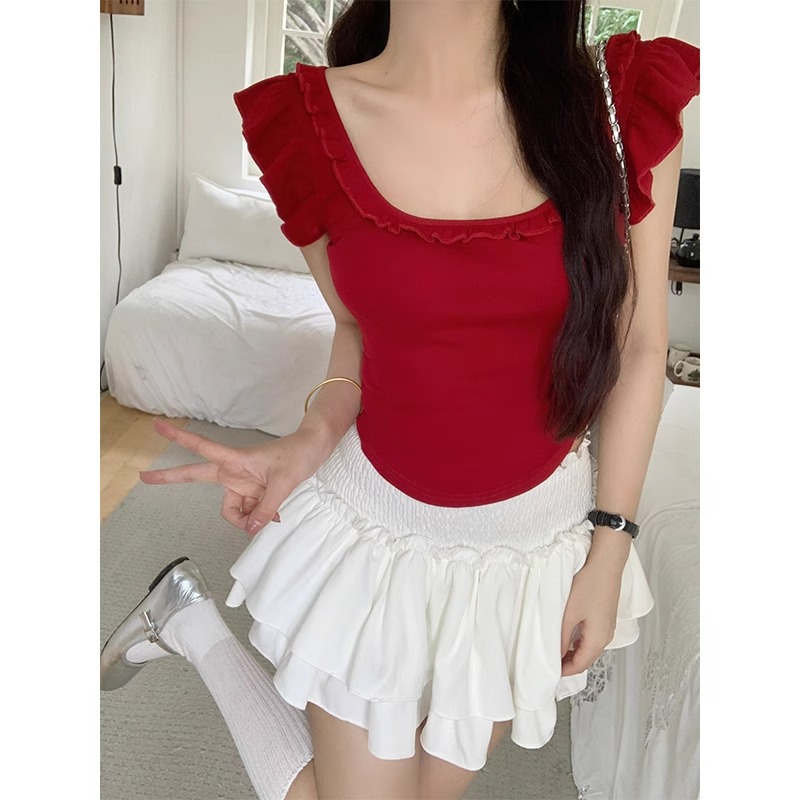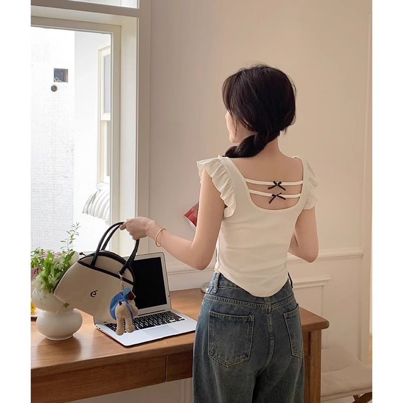 法式方领木耳边弧形下摆美背短袖纯欲蝴蝶结T恤女短款露脐上衣夏
