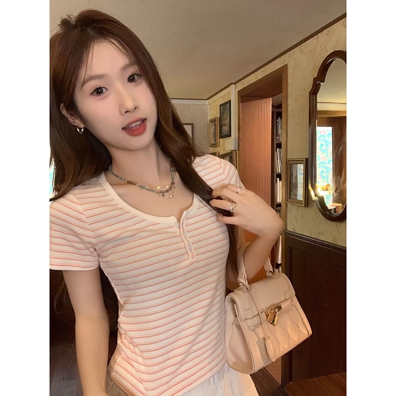 蓝白条纹短袖正肩女t恤春夏新款chic小众设计感修身短款上衣