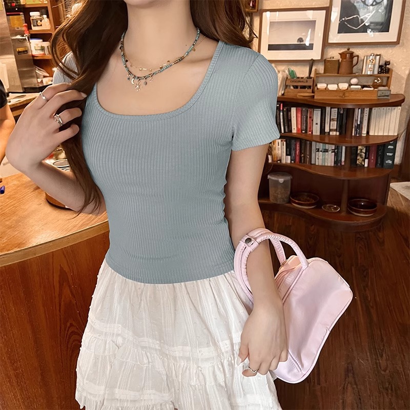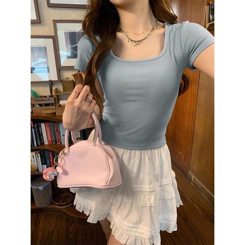 花灰色坑条方领正肩短袖t恤女春夏新款辣妹纯欲风紧身显瘦短上衣
