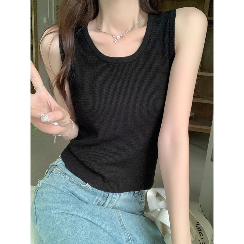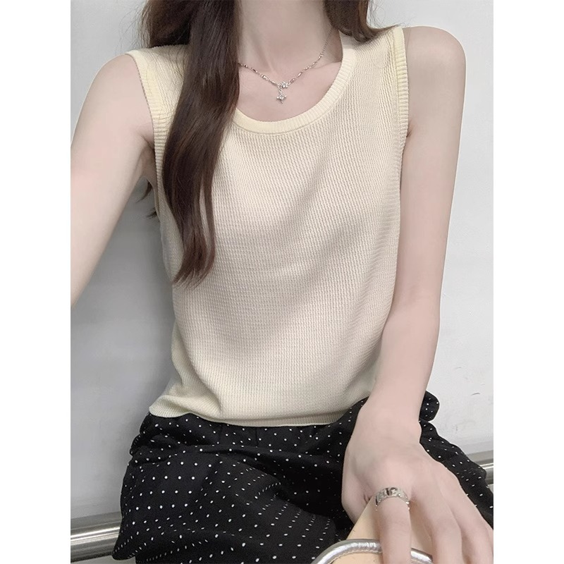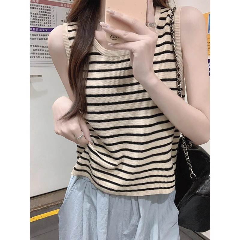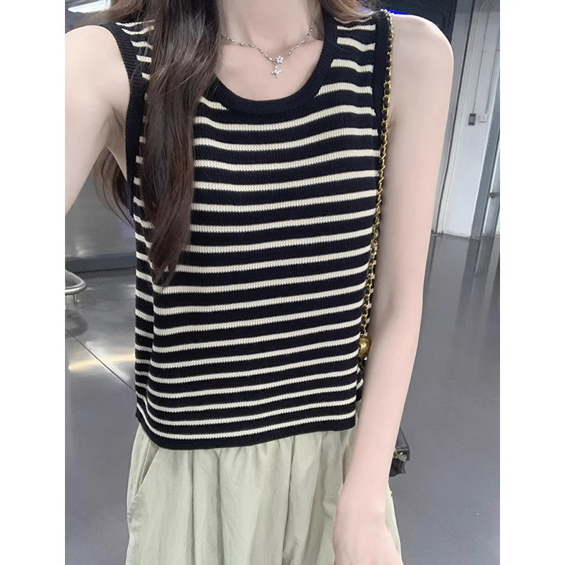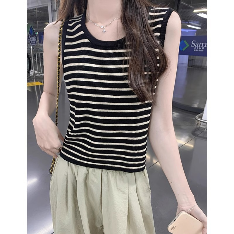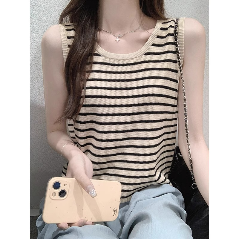 夏季冰丝针织薄款撞色u型领修身吊带背心女法式复古无袖条纹上衣