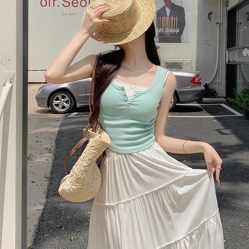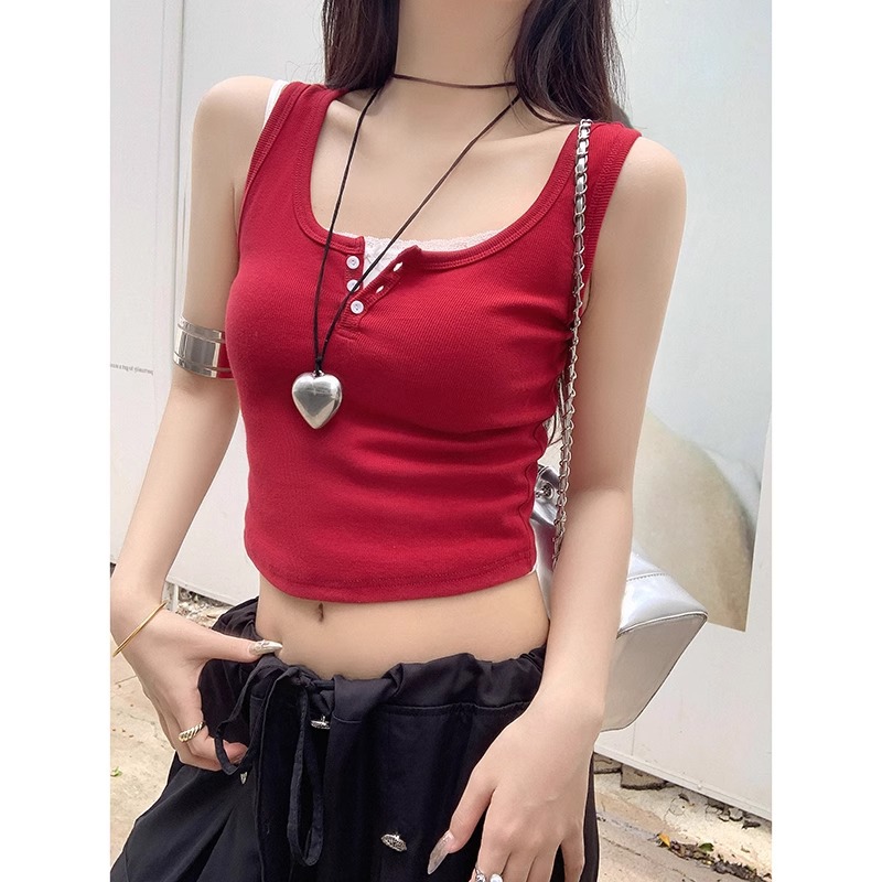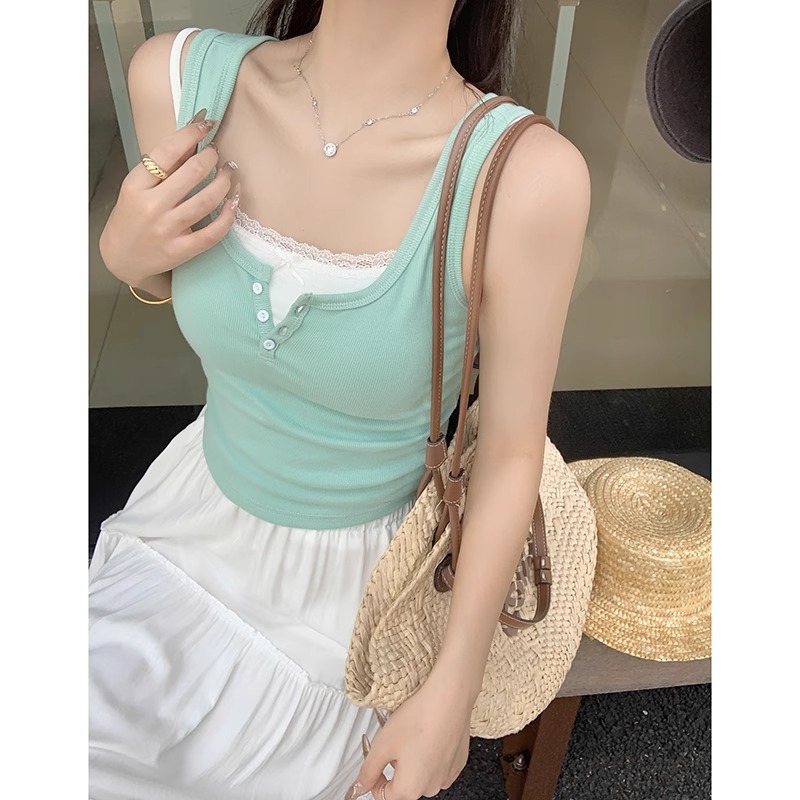 韩版纯色无袖上衣花边纽扣甜辣妹显白短款露锁骨夏季小背心女