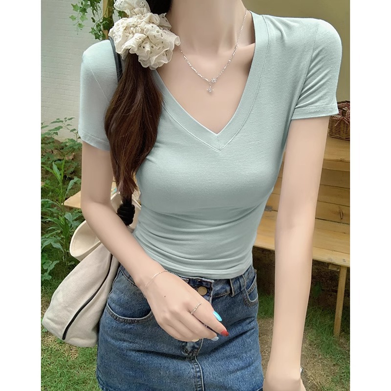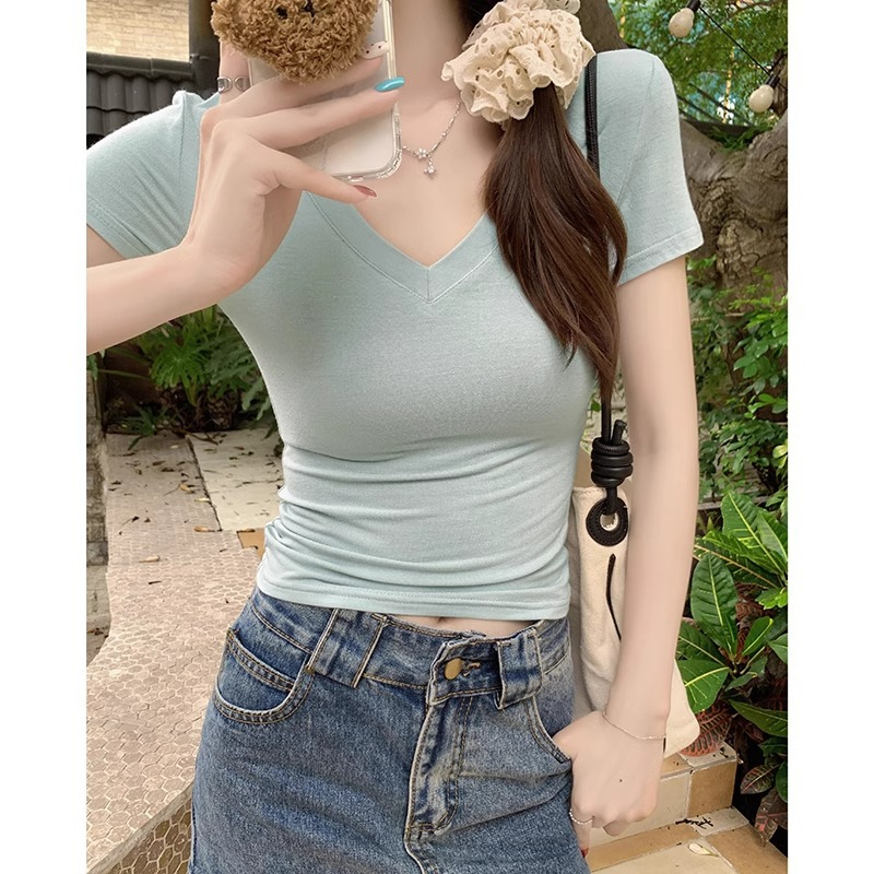 蓝色v领锁骨正肩短袖女纯欲紧身收腰短款辣妹T恤休闲百搭夏季上衣