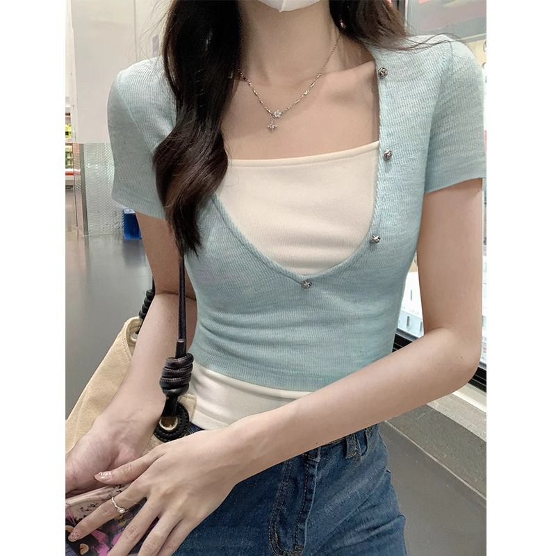 纯欲甜辣妹假两件蓝色短袖t恤女正肩春夏韩系穿搭半开领拼色上衣