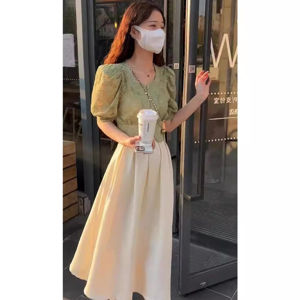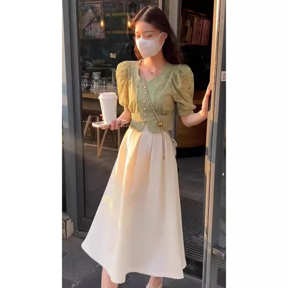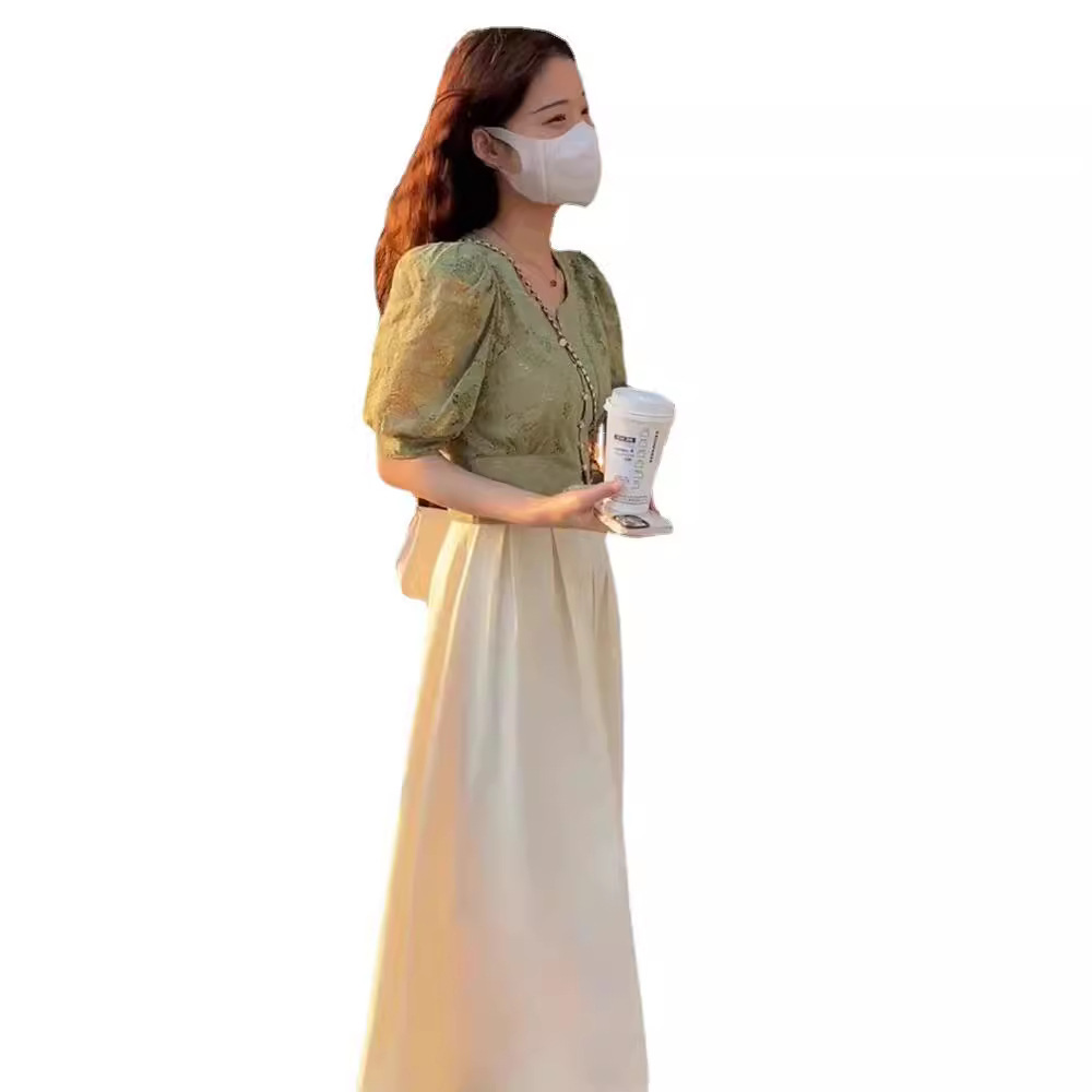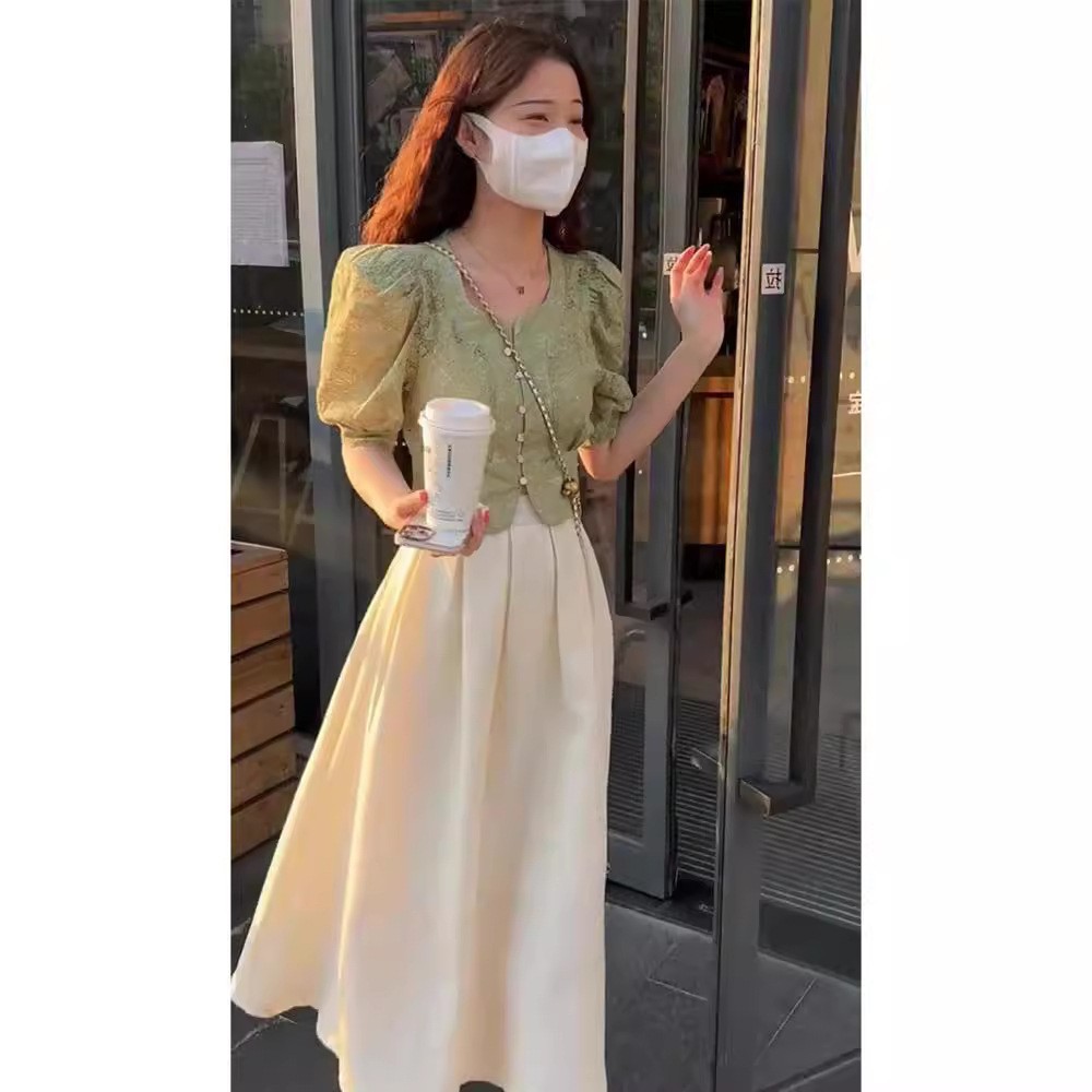 夏季新款轻熟风港味复古绿色小个子泡泡袖上衣半身裙两件套装
