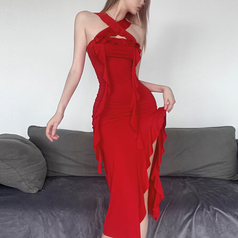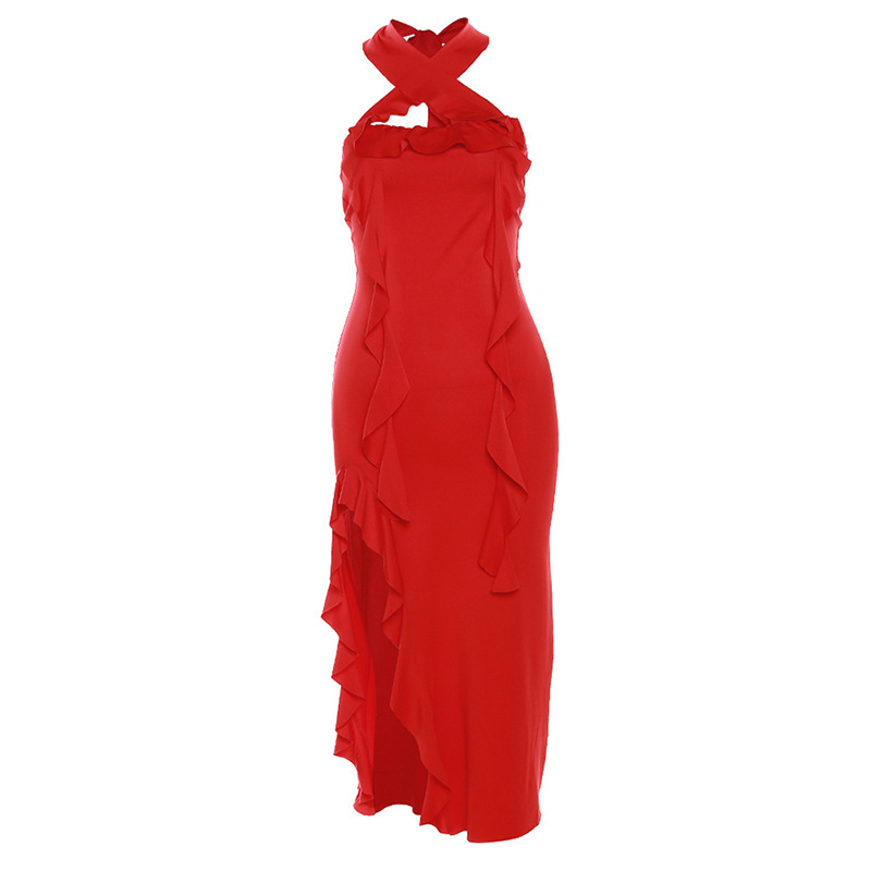 欧美风夏季新款女装挂脖露背修身包臀开衩荷叶边连衣裙