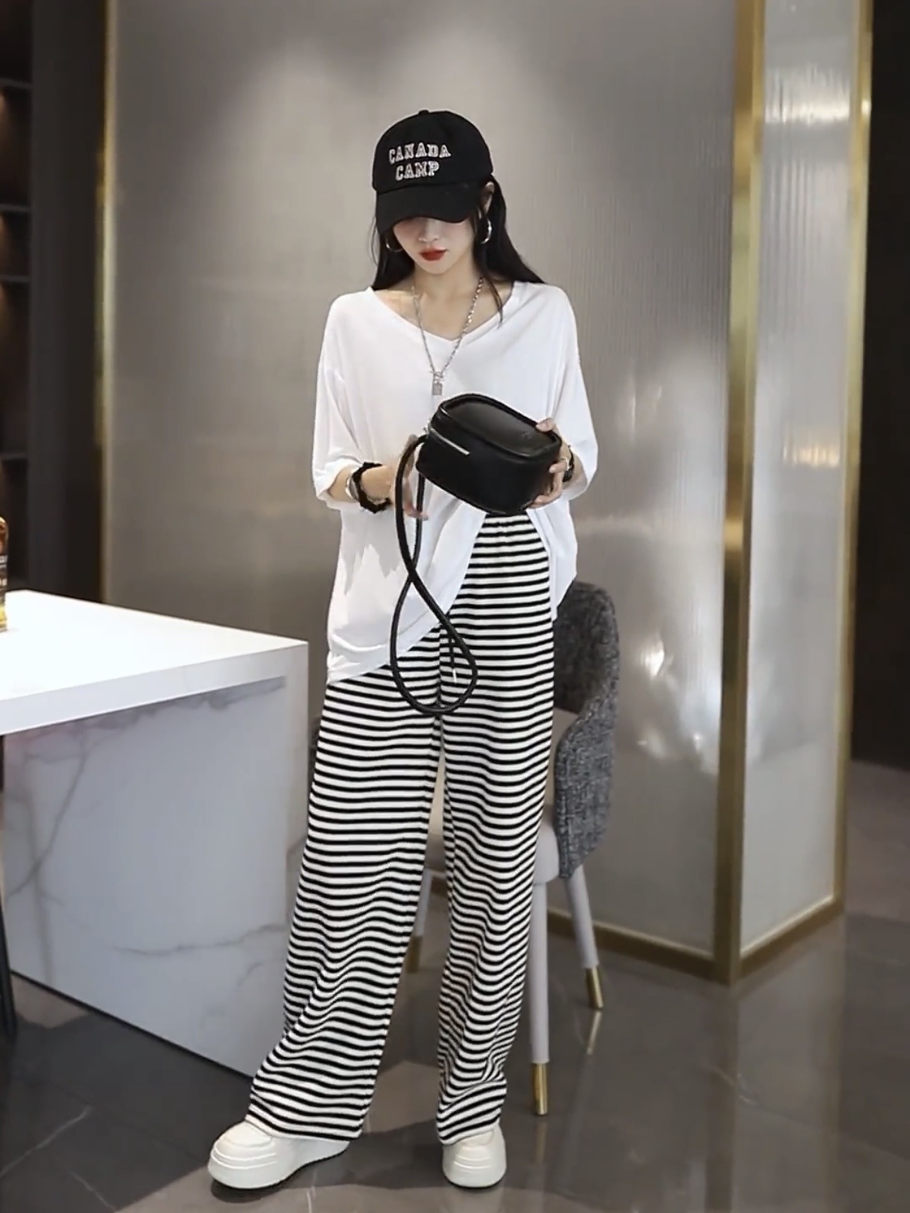 黑白条纹阔腿裤女夏季新款慵懒风休闲拖地裤子宽松垂感直筒裤