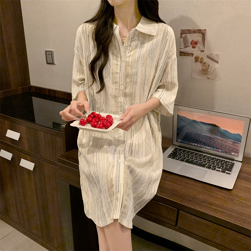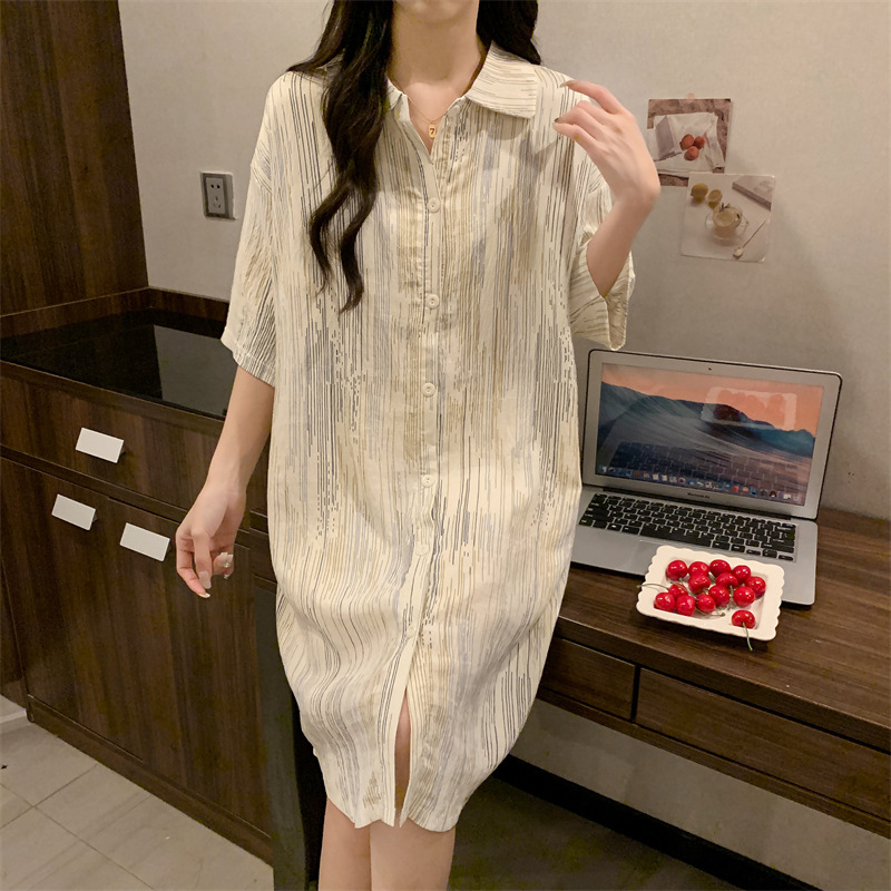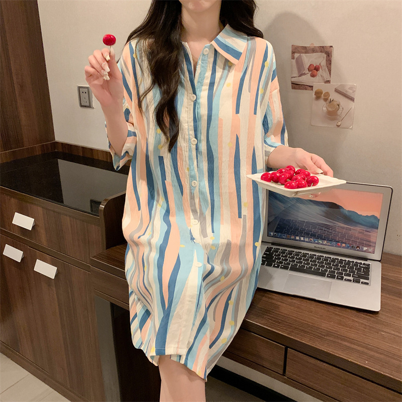 睡衣女夏季新款印花公主风云朵棉翻领开衫短袖睡裙可外穿家居服