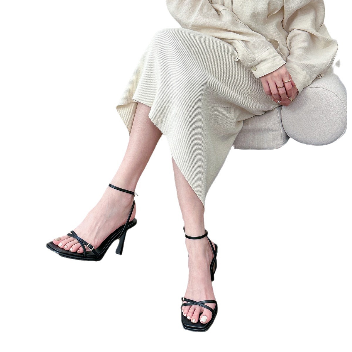 elingstudio 肯豆感!2023年新款夏季白色方头细带一字高跟凉鞋
