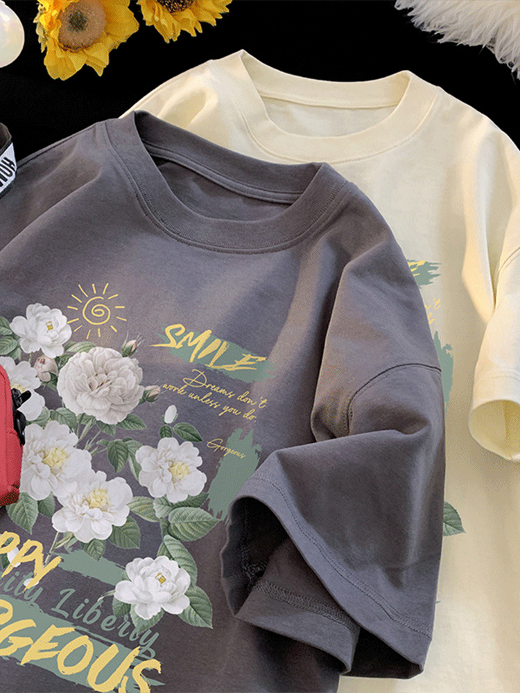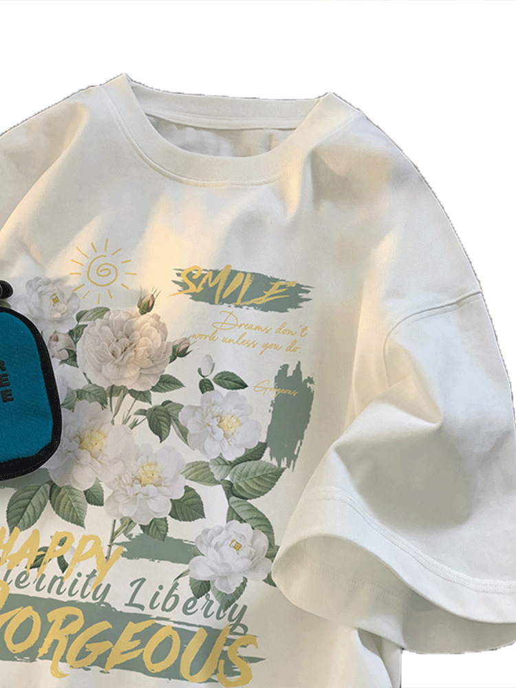 山茶花印花短袖t恤男潮牌潮流美式圆领衣服夏季宽松大码重磅体恤