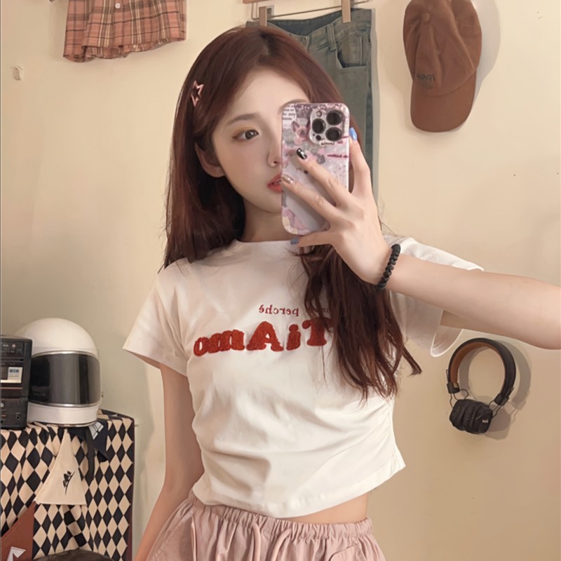 纯棉纯欲白色正肩短袖T恤女夏季设计感小众多巴胺穿搭甜辣短款