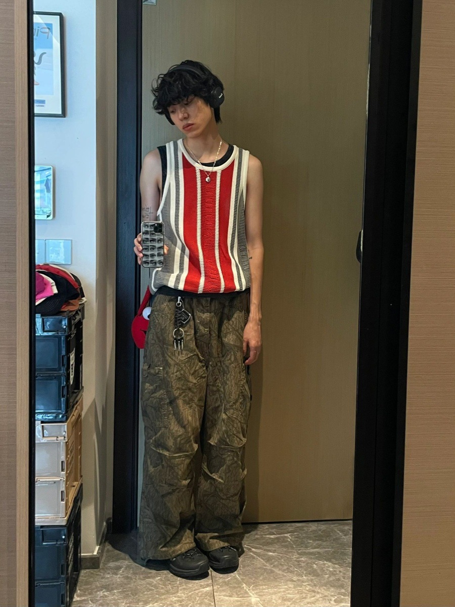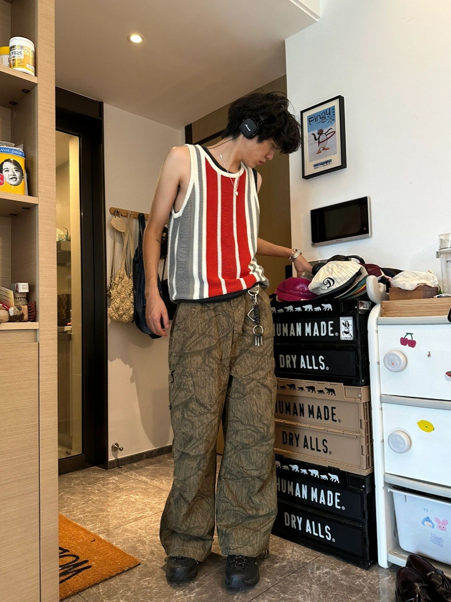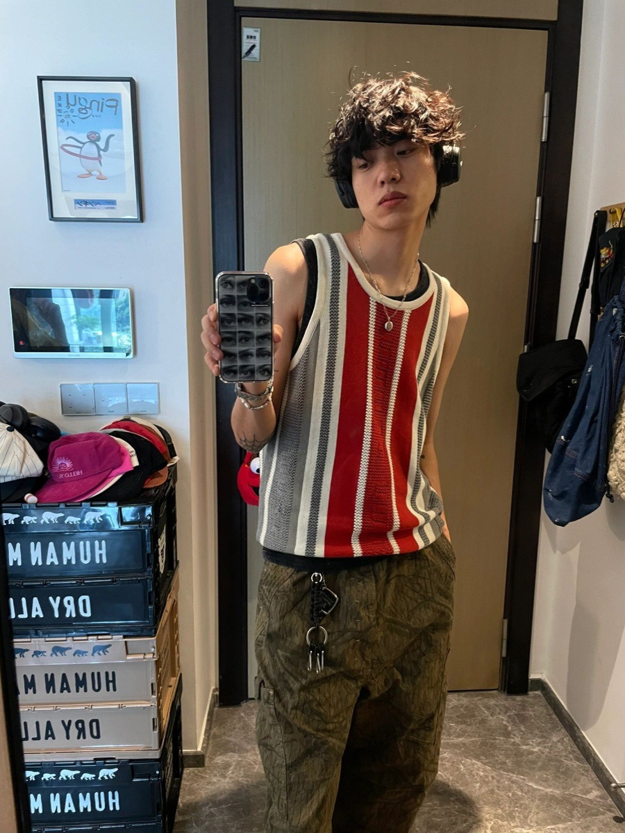 潮牌美式拼色条纹针织提花外穿背心男士夏季宽松街头休闲套头上衣