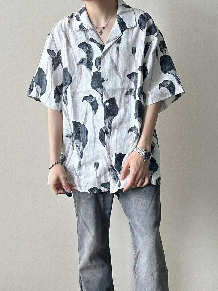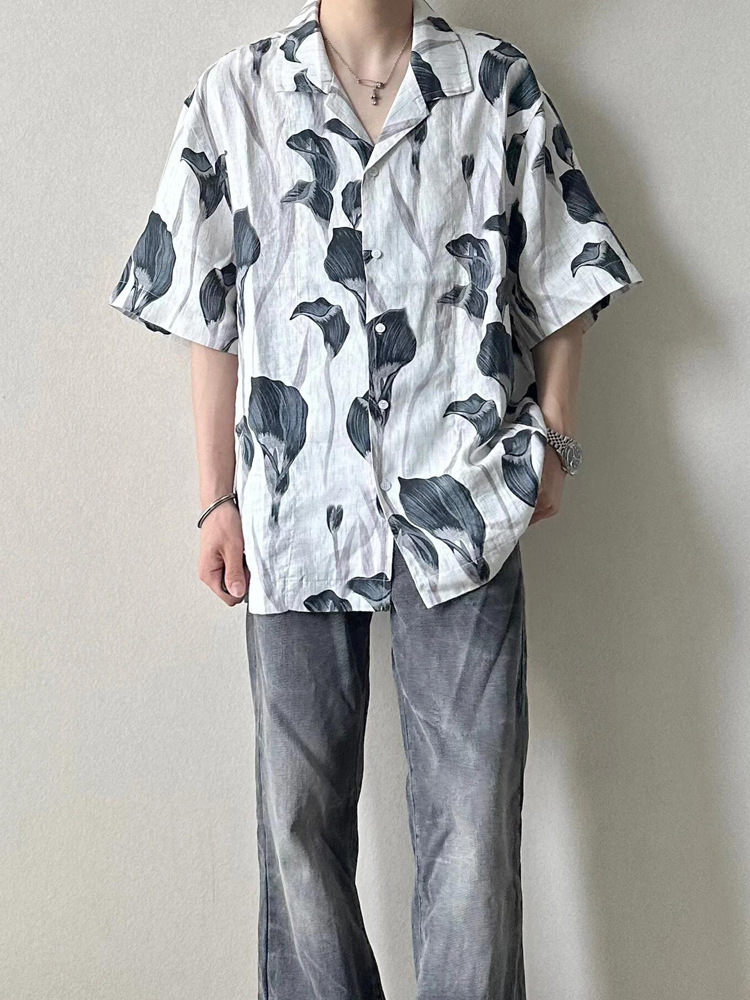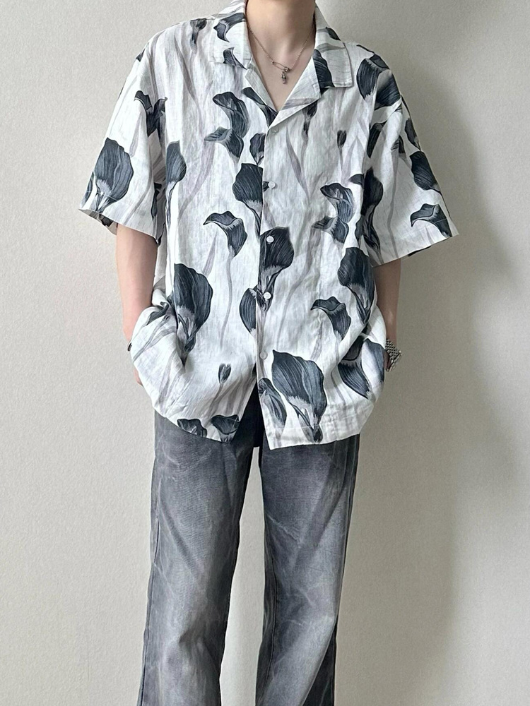 ins美式复古设计感古巴领短袖印花衬衫男夏季宽松痞帅clenfit衬衣