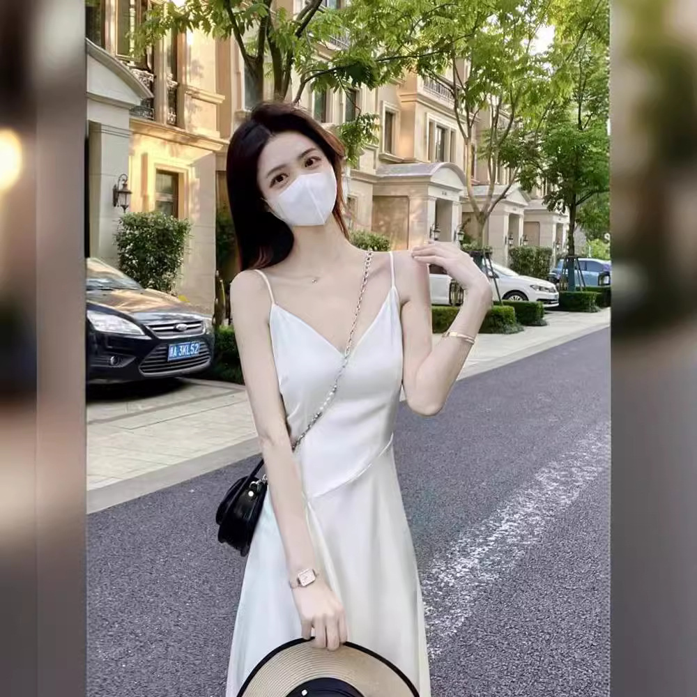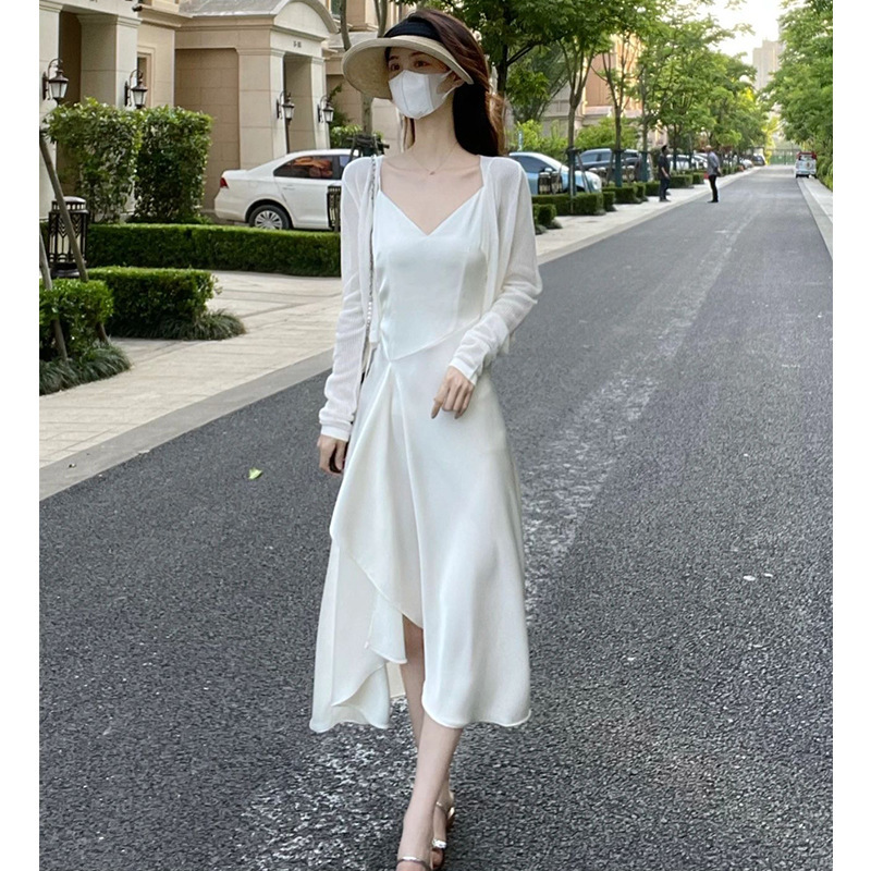 夏季新款法式温柔风套装白色开衫荷叶边吊带连衣裙子两件套装