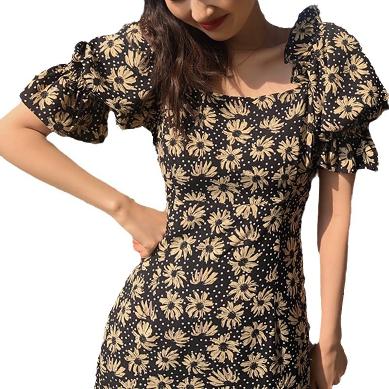 夏季新款法式复古方领雪纺碎花连衣裙显瘦气质开叉泡泡袖裙子