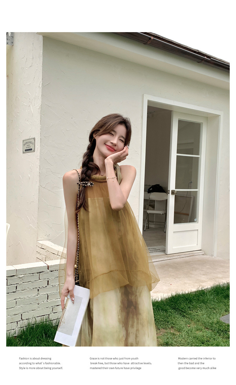 气质挂脖网纱扎染雪纺裙子新中式国风假两件连衣裙女夏季新款仙女