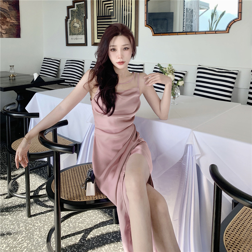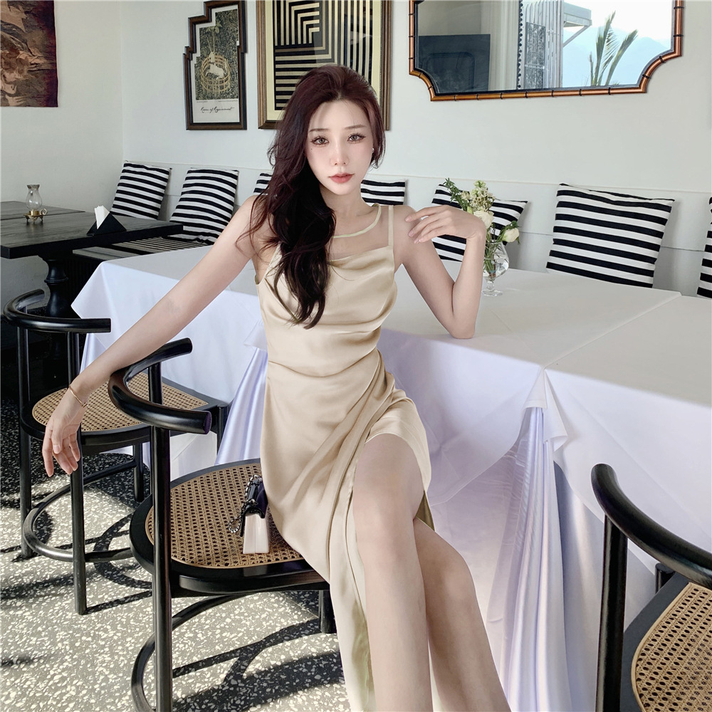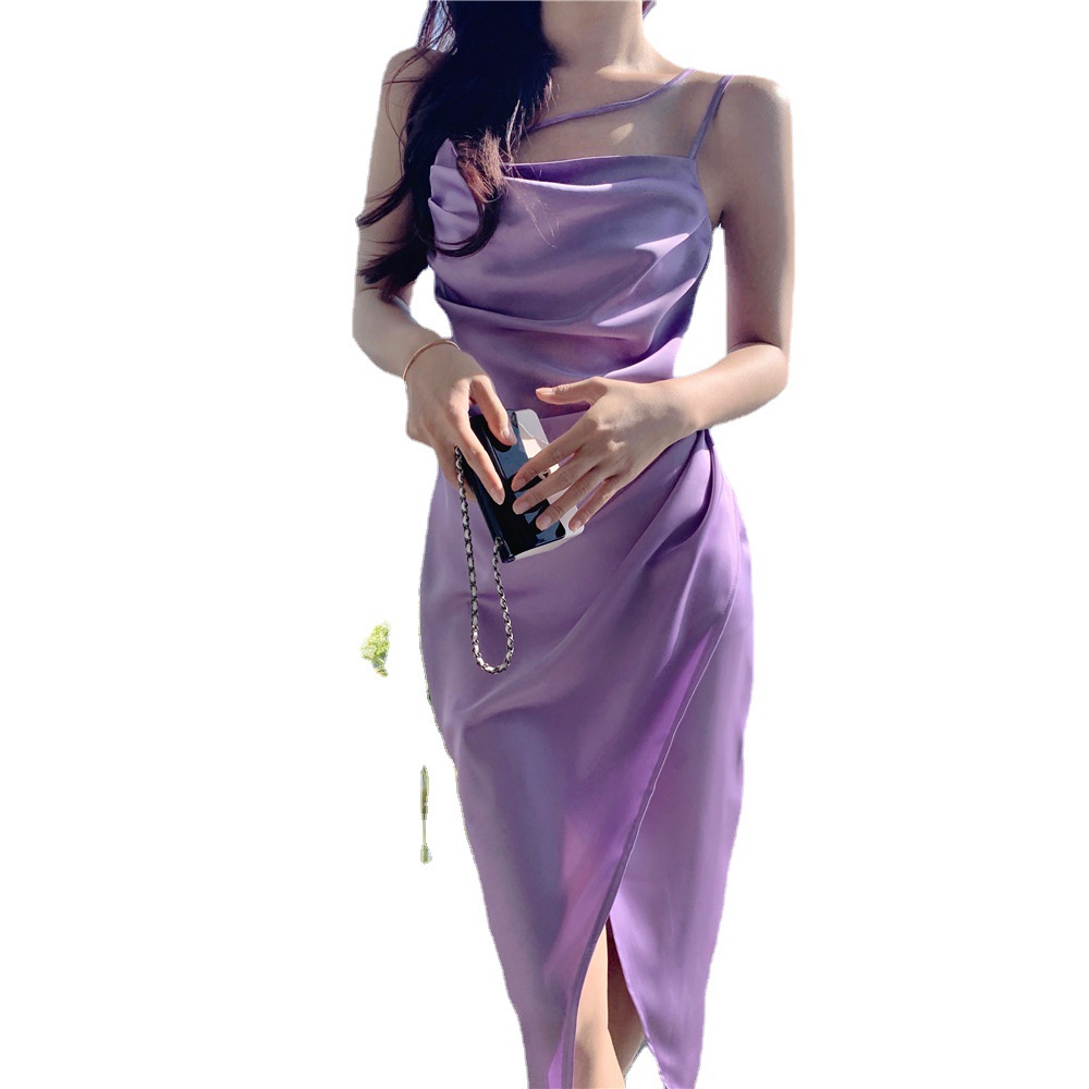 法式醋酸缎面吊带连衣裙女夏季裙子名媛高腰高级感长款a字裙