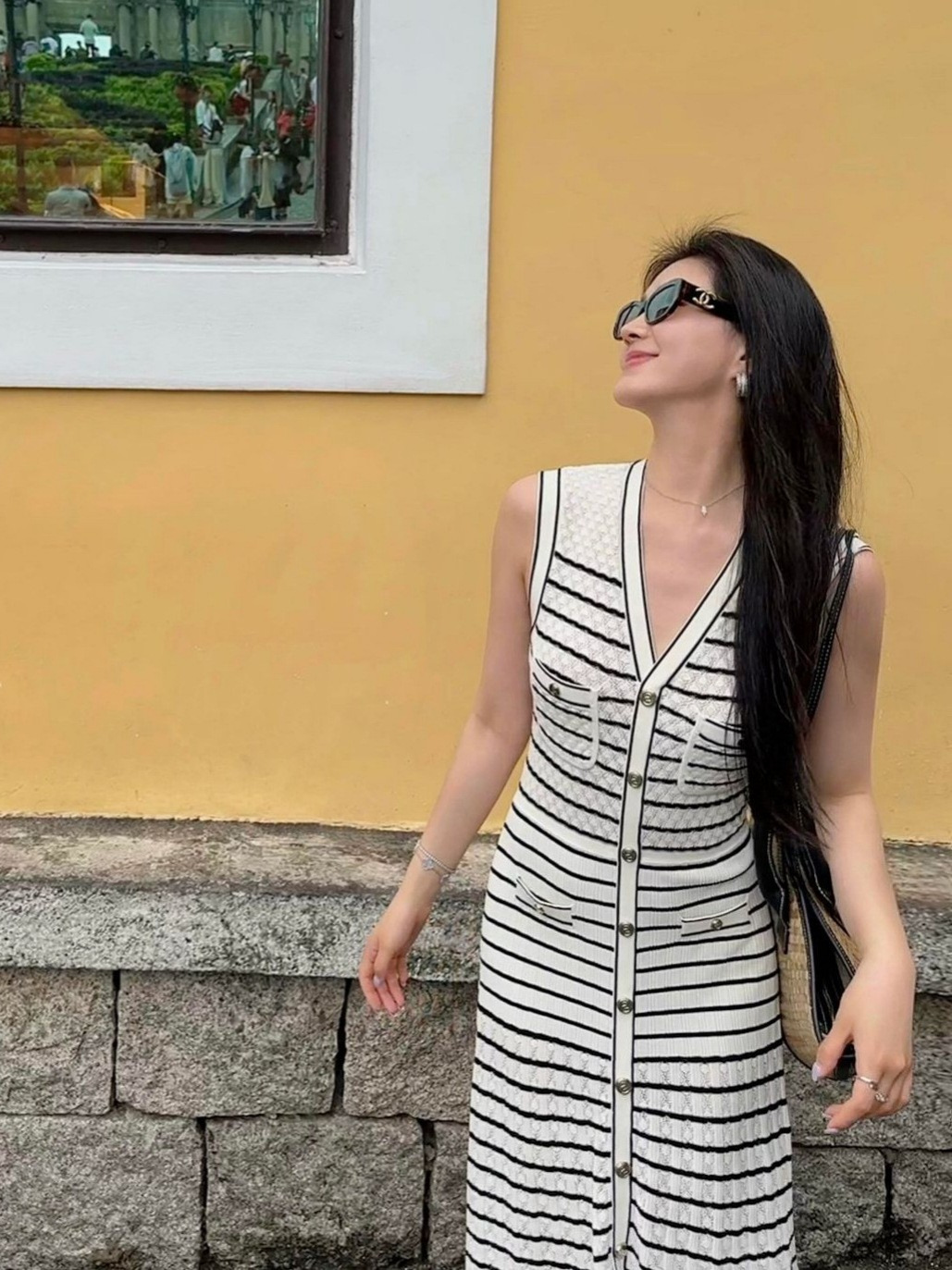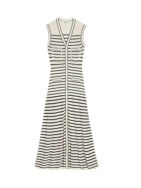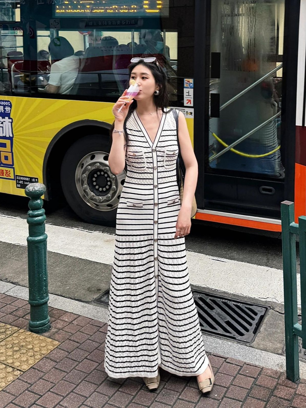 春夏新款女装法式撞色长款收腰针织连衣裙赫本风条纹无袖背心裙子