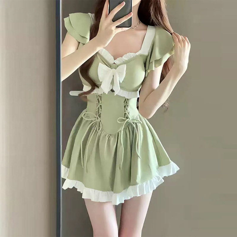 泳衣女连体新款少女纯欲风收腰保守显瘦泳装连衣裙式温泉泳衣