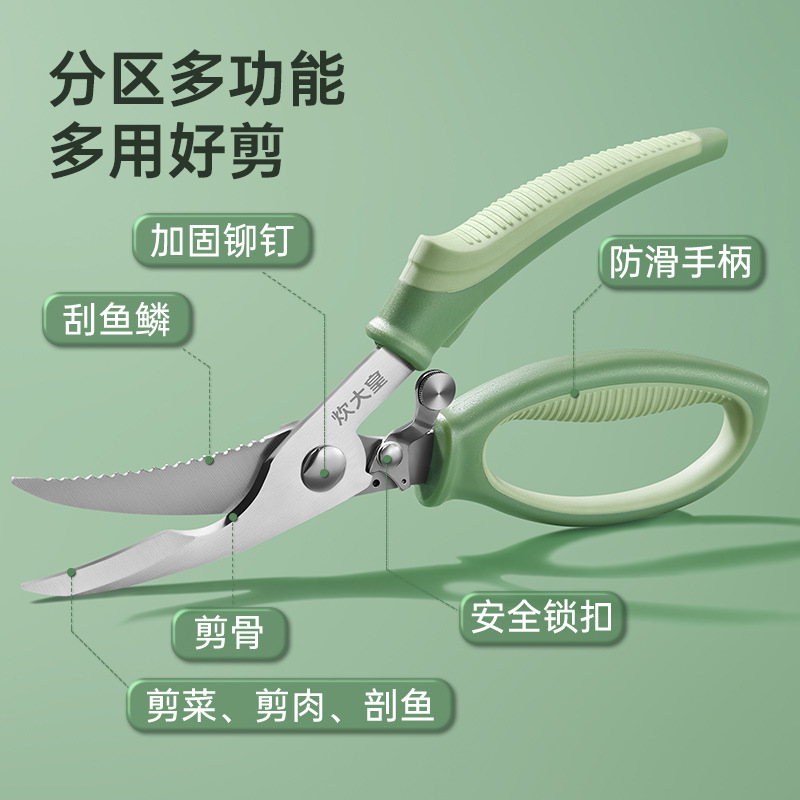 炊大皇新款不锈钢鸡骨剪省力多功能厨房剪防滑手柄带锁止功能剪刀