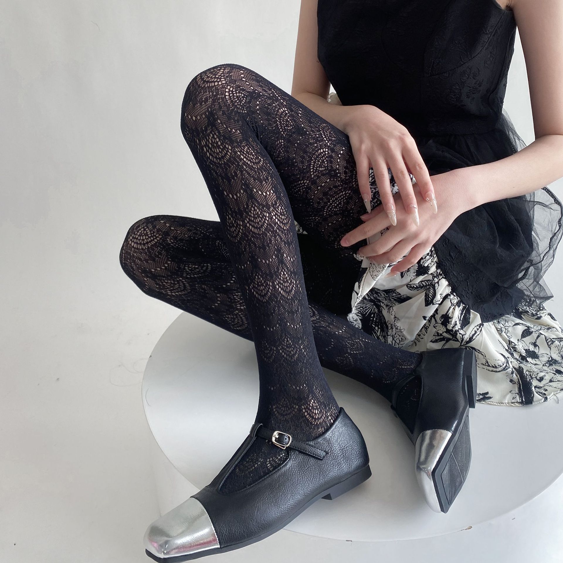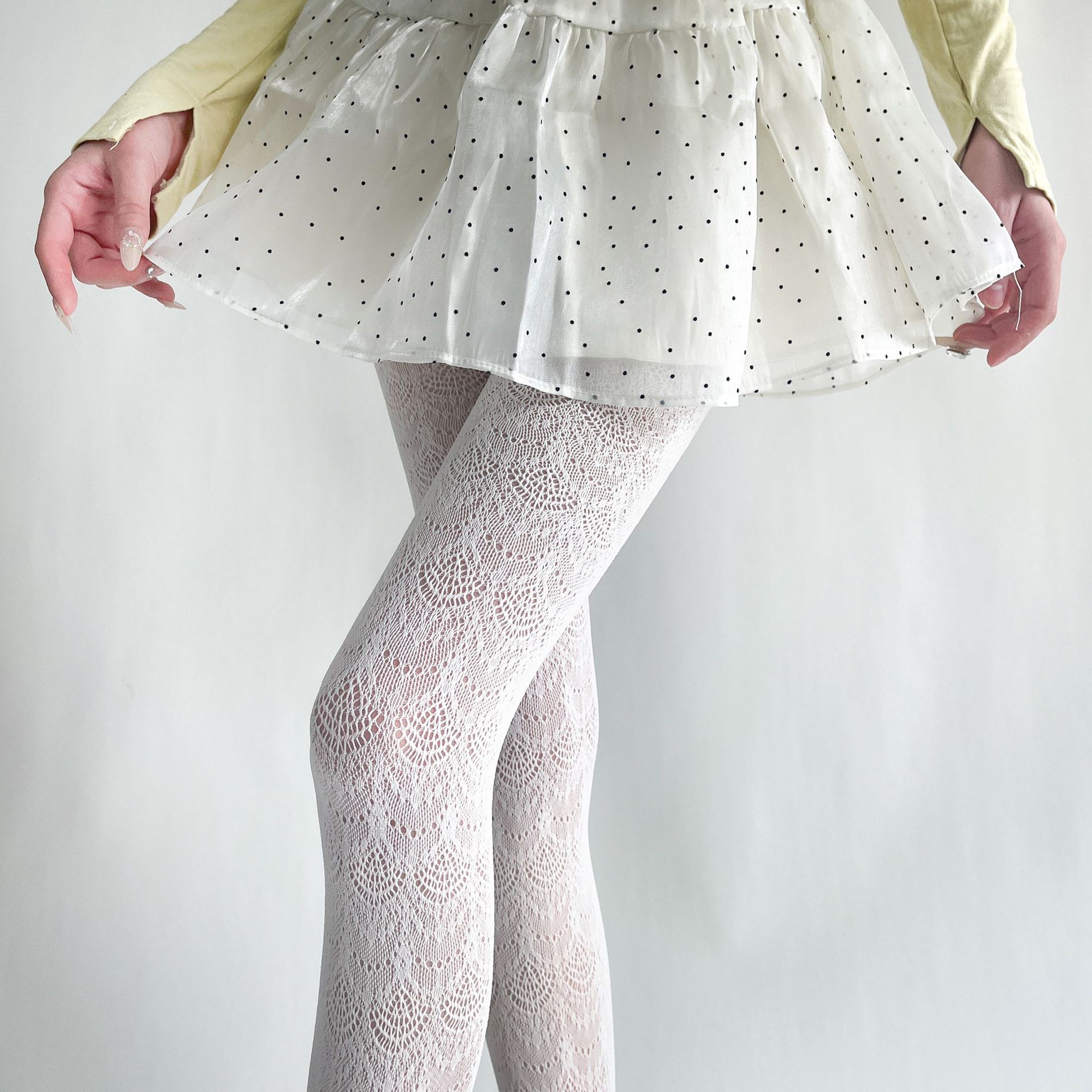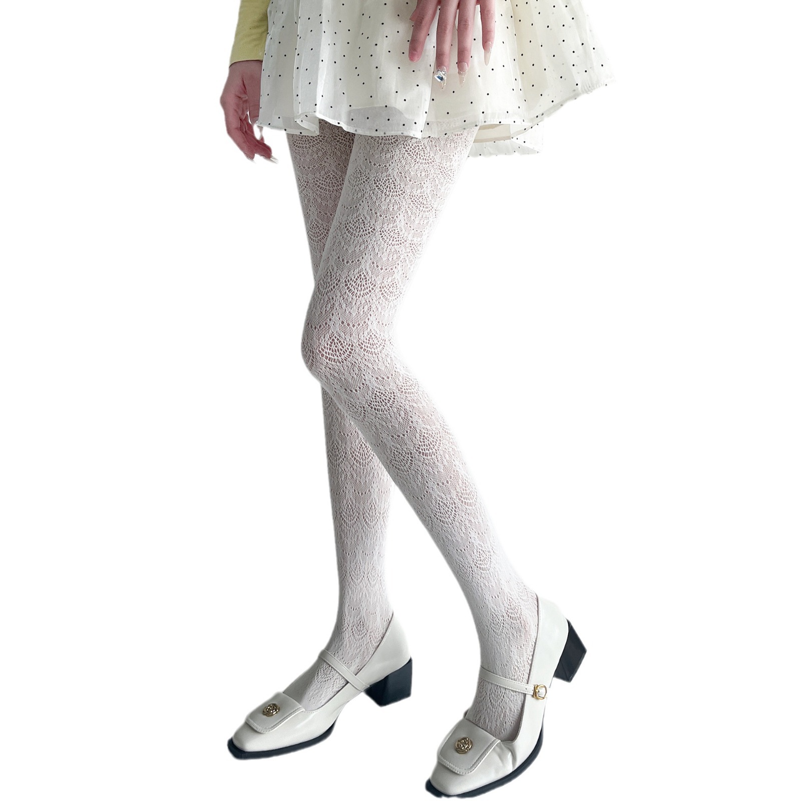 日系春秋薄款甜美白色复古凤尾提花镂空网袜萝莉少女打底连裤袜女