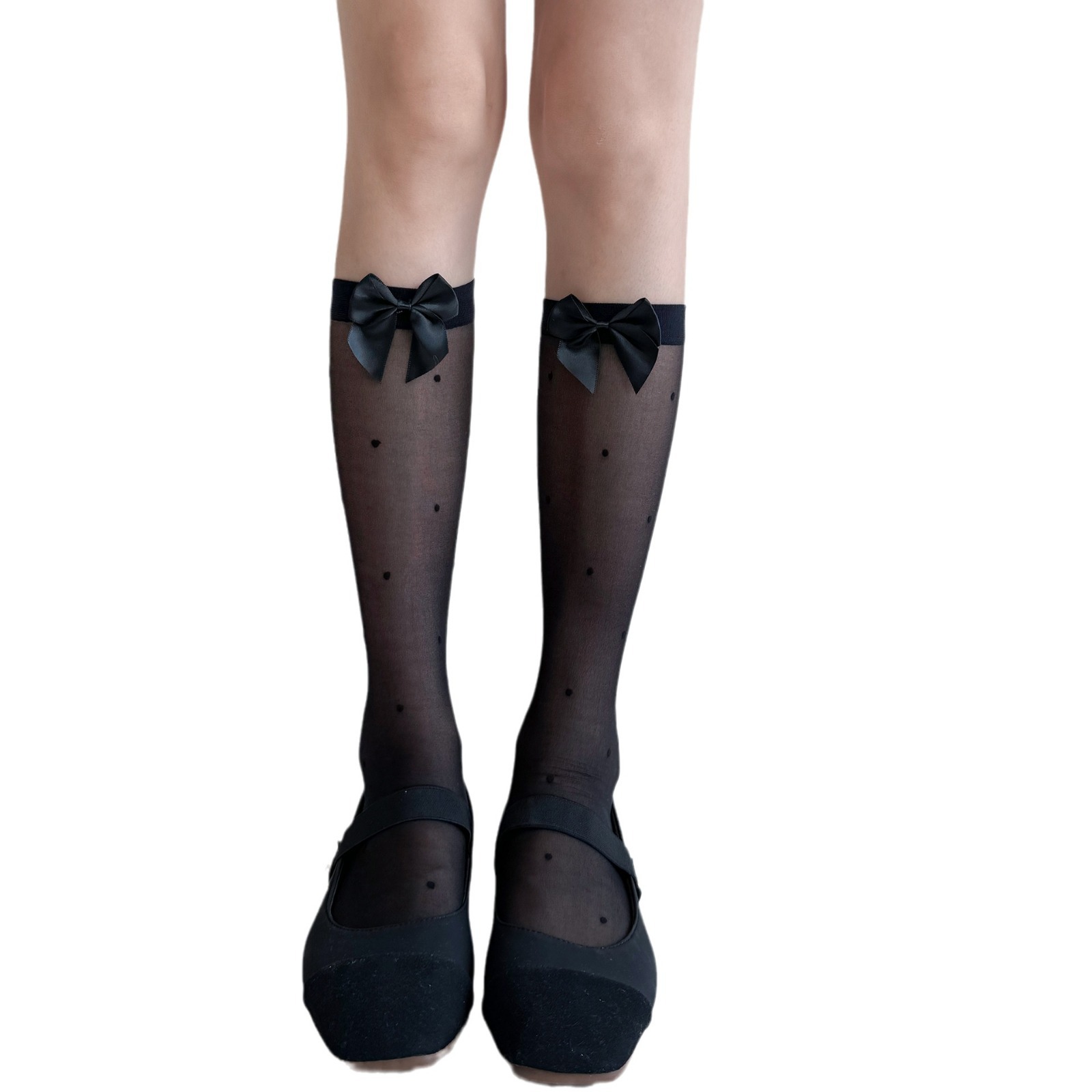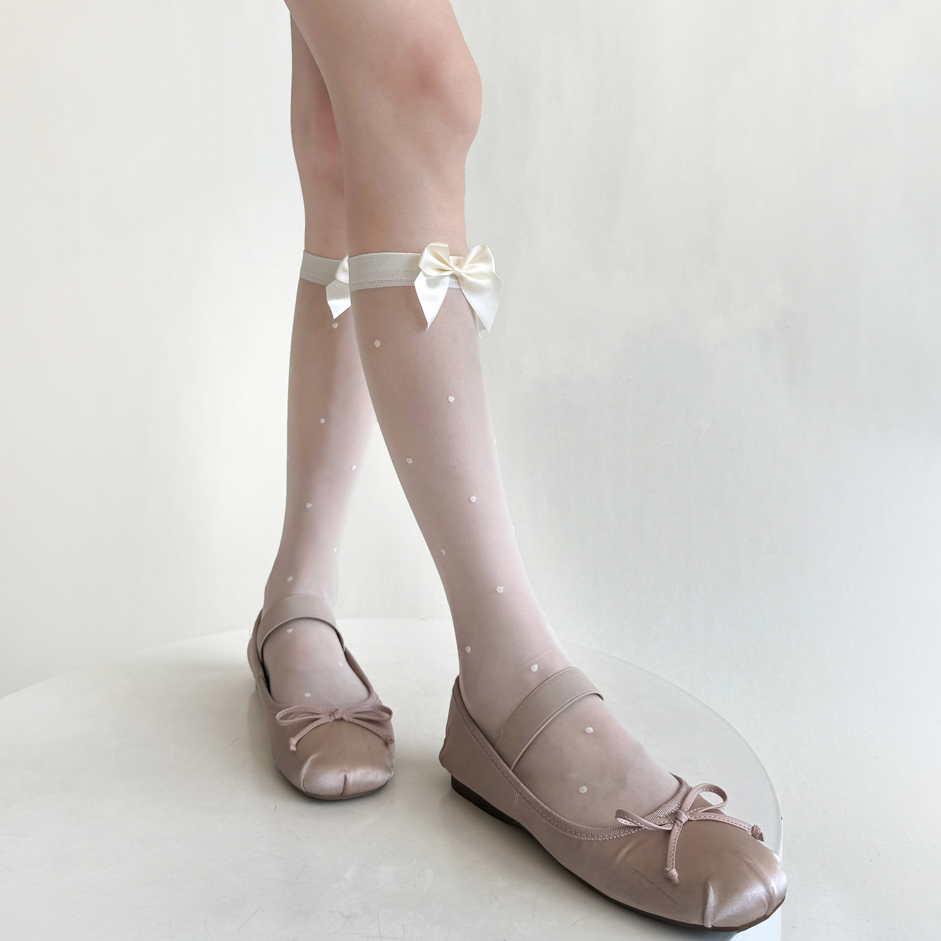 夏季超薄任意剪圆点透肉小腿袜奶白色甜美蝴蝶结堆堆少女中筒袜子