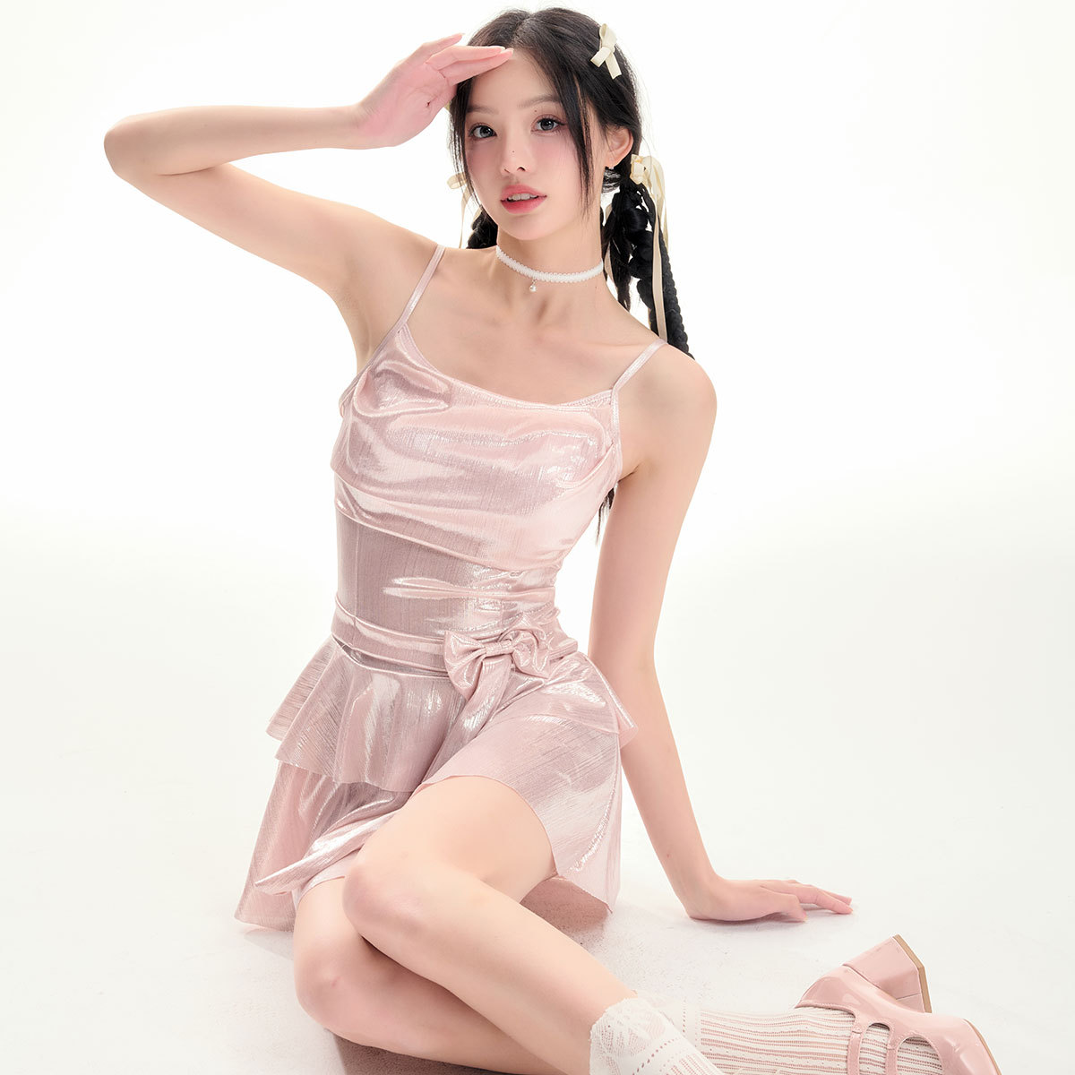 辣妹性感荷叶边吊带百褶连衣裙女粉色珠光亮面修身温泉泳装