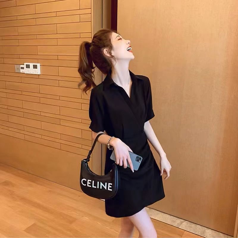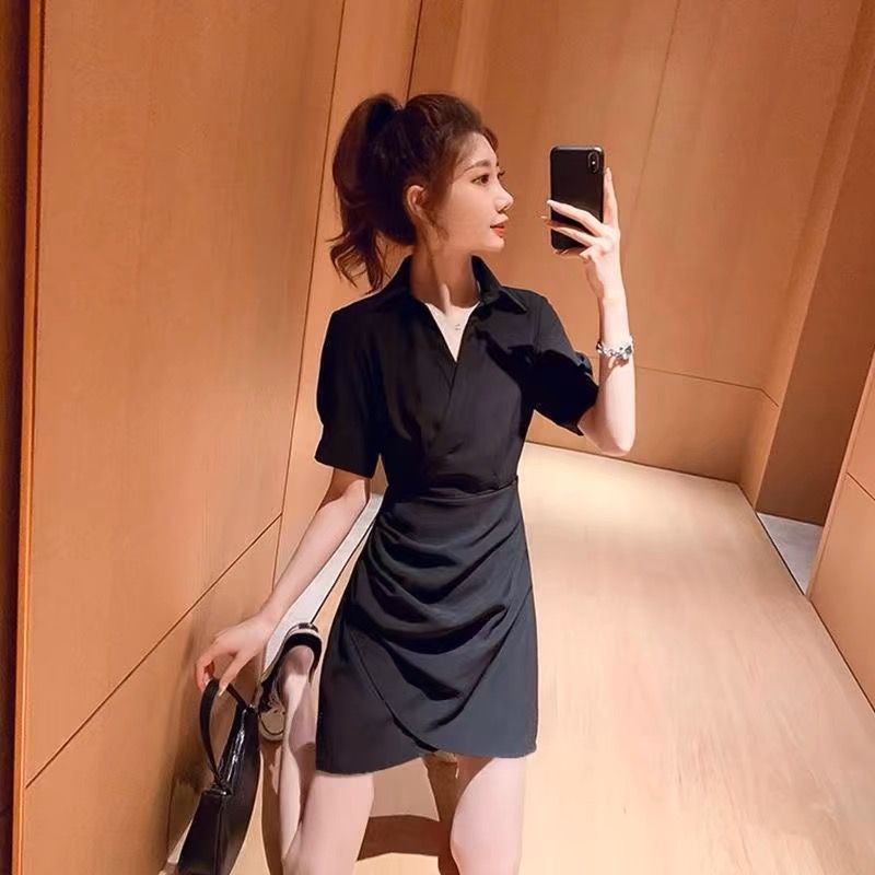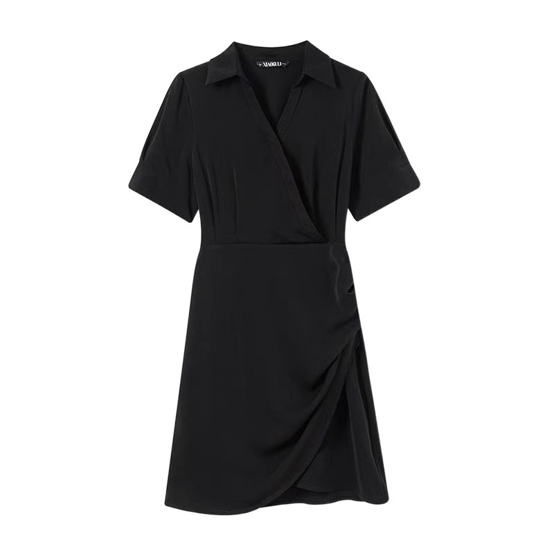 赫本风感POLO连衣裙收腰显瘦气质小黑裙不规则褶皱裙子女夏季