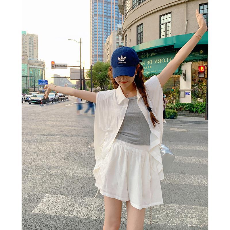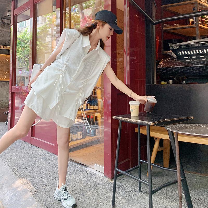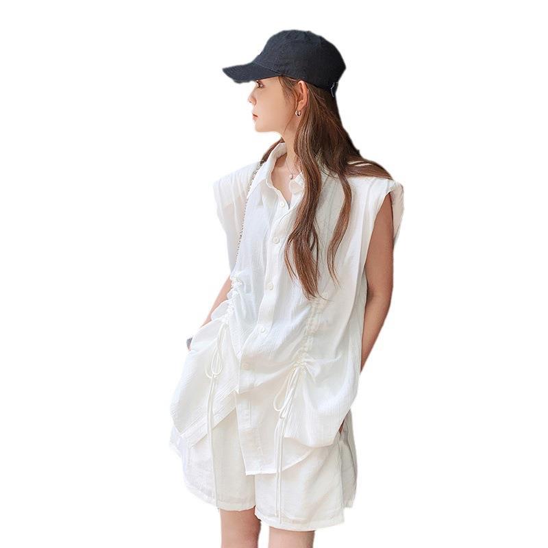 实拍抽褶系带设计单排扣宽松休闲polo领白衬衫显瘦高腰短裤套装女