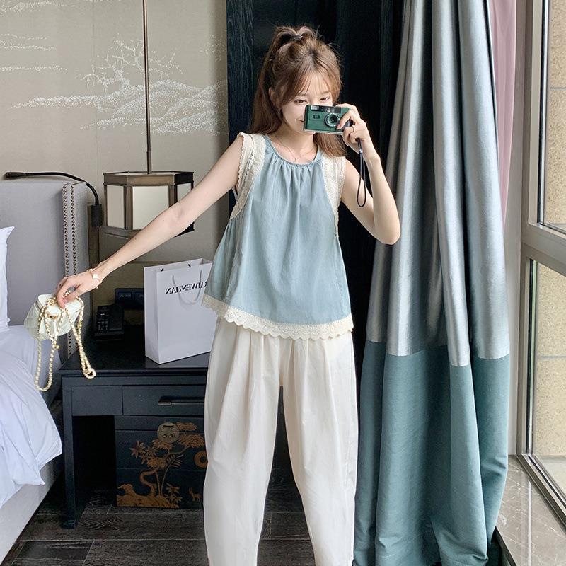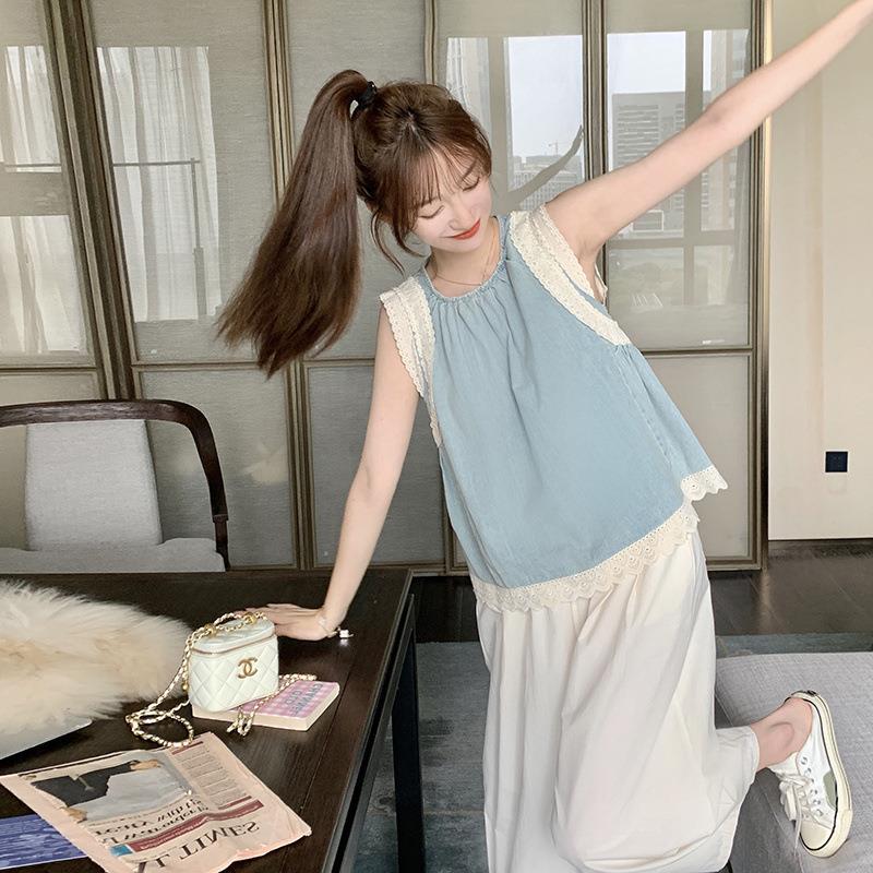 实拍可盐可甜少女感蕾丝拼接无袖牛仔背心高腰显瘦直筒裤两件套女