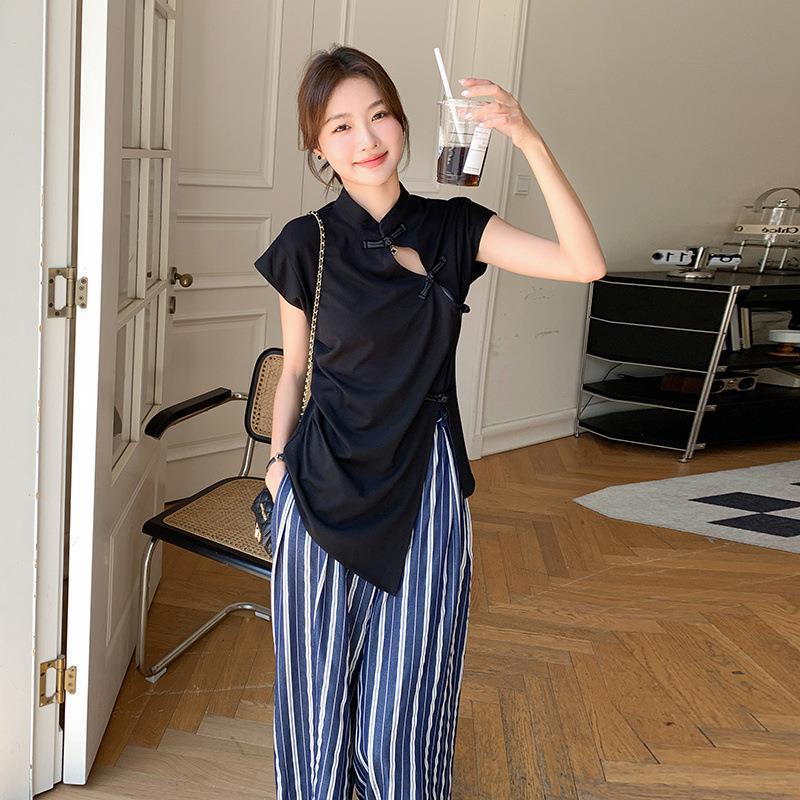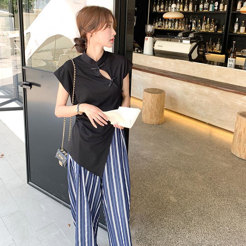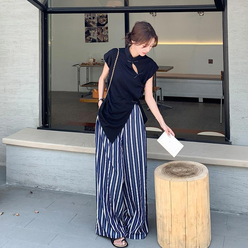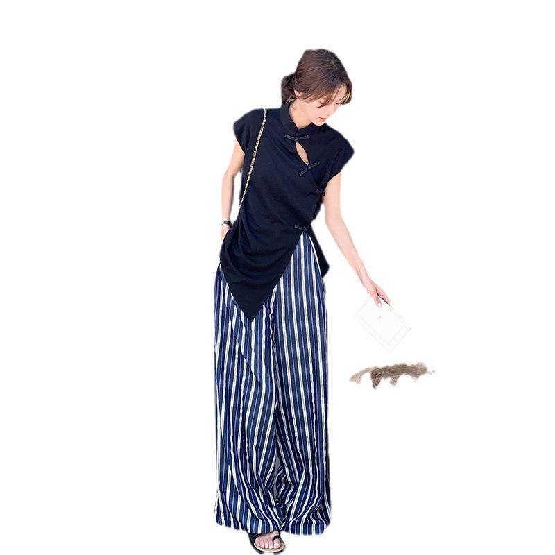 实拍新中式立领国风盘扣开衩上衣高腰显瘦撞色条纹阔腿裤两件套女
