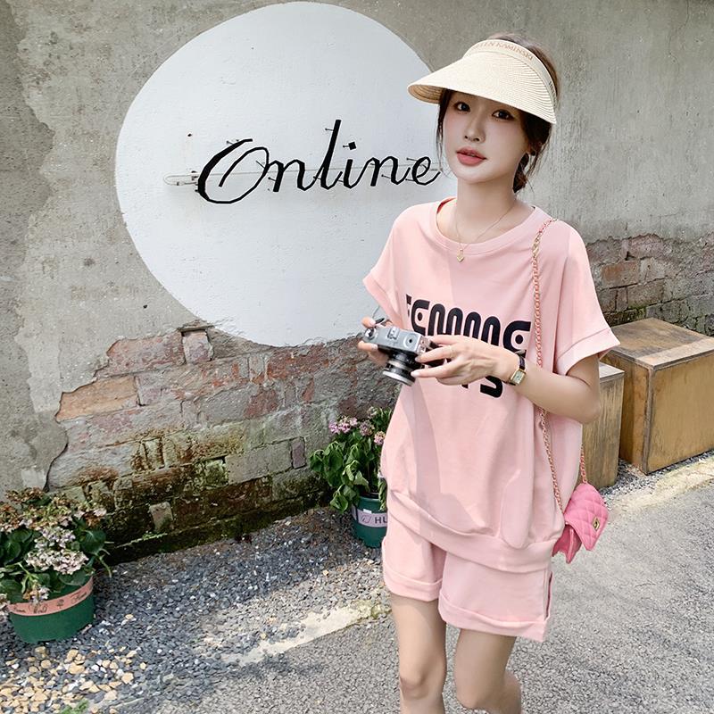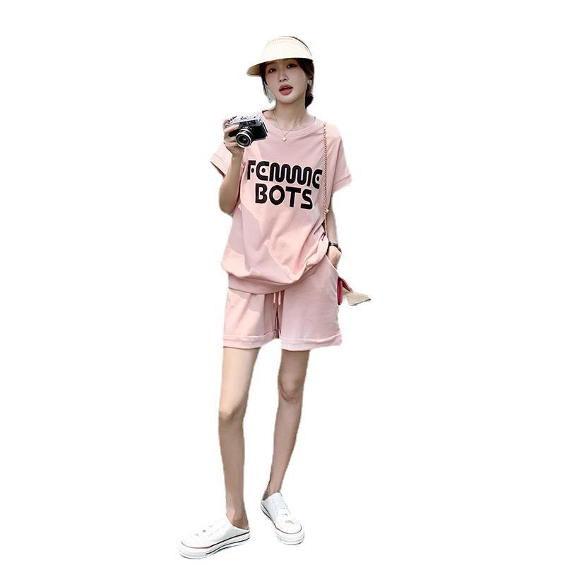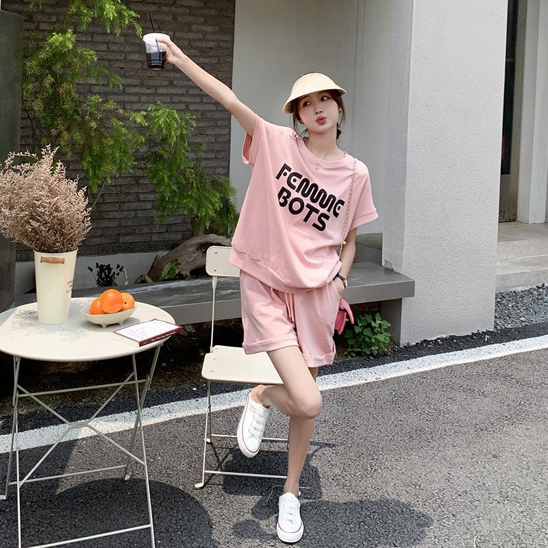 夏季韩版休闲显瘦圆领落肩袖T恤松紧抽绳甜美短裤运动套装女