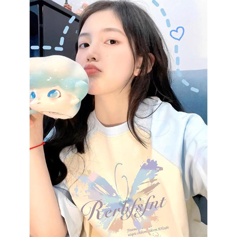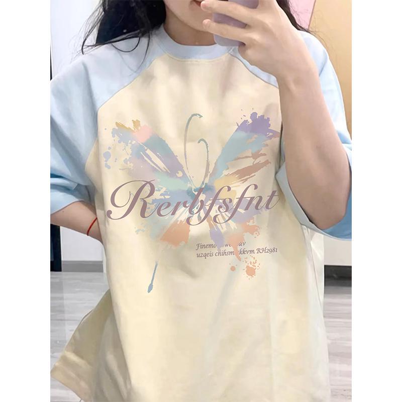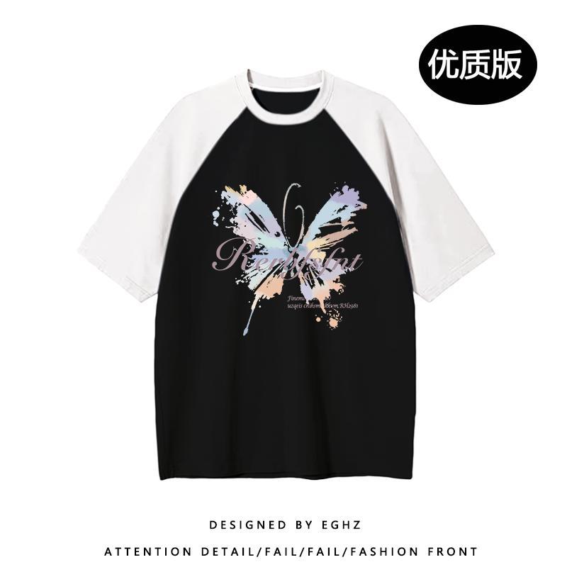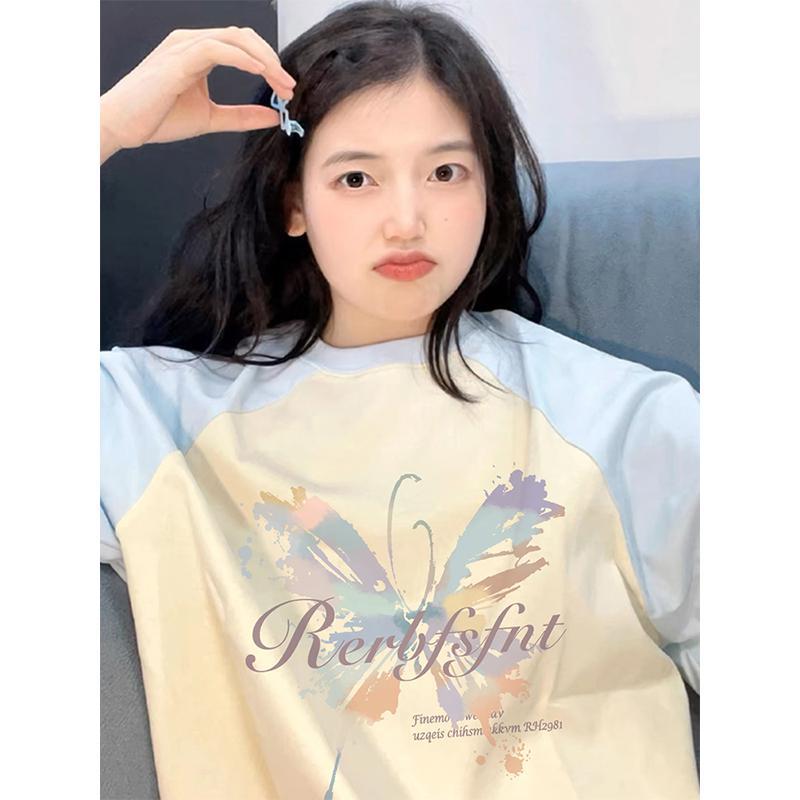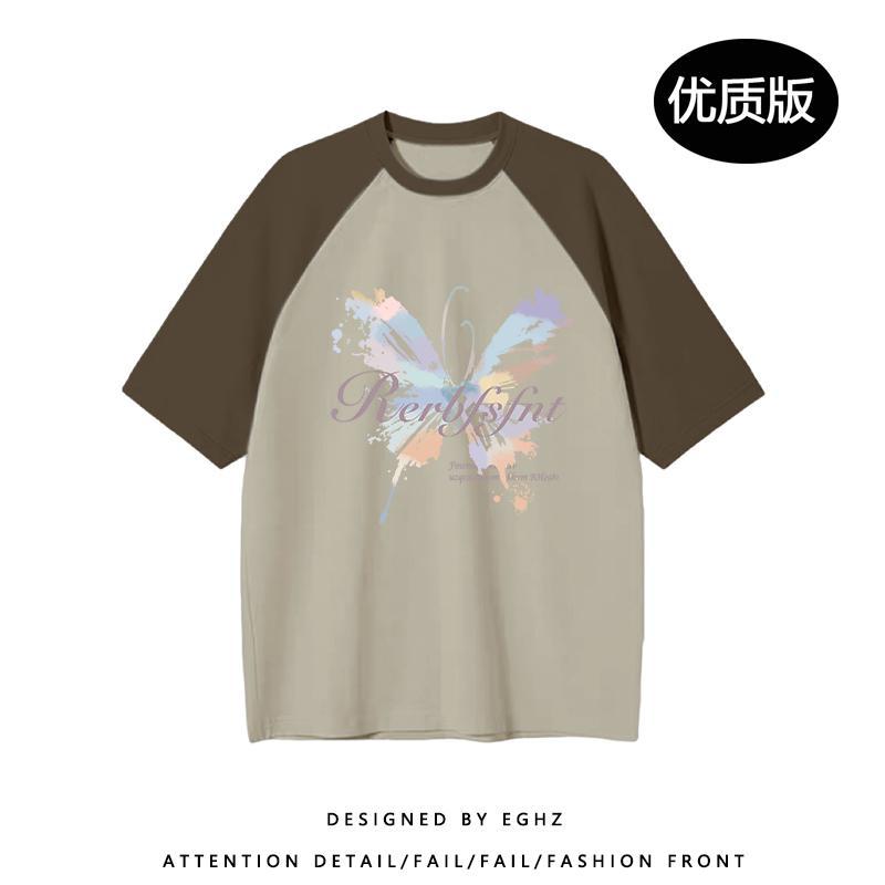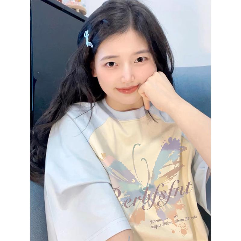 重磅插肩撞色拼接t恤女新款美式高街小众独特宽松半袖上衣潮