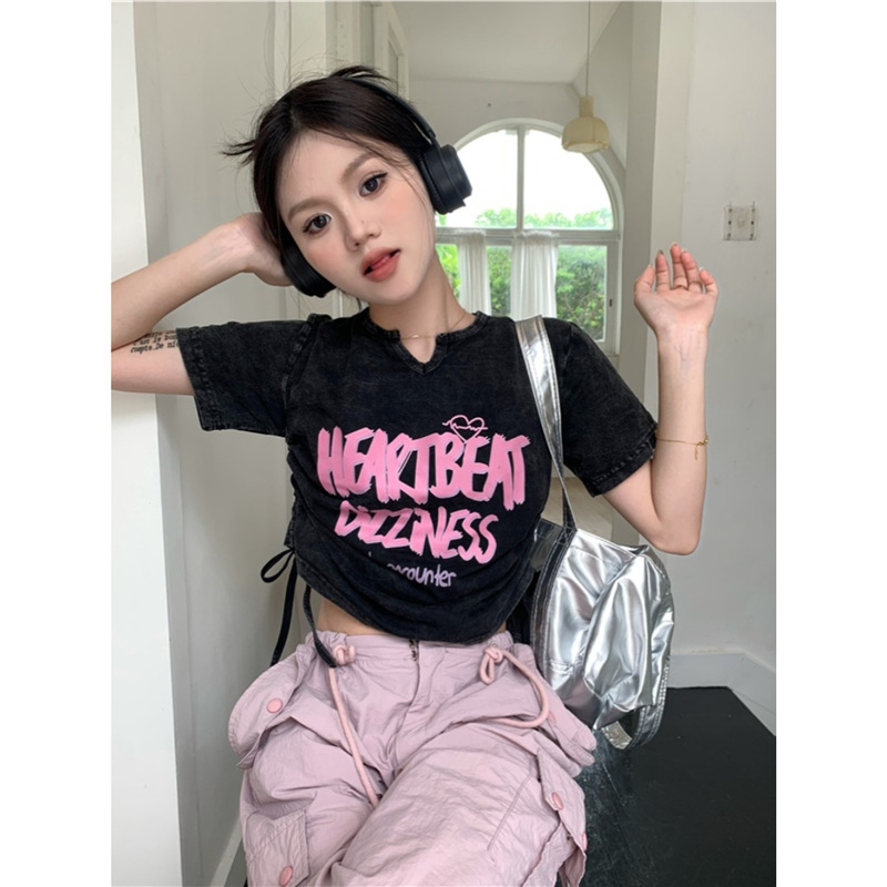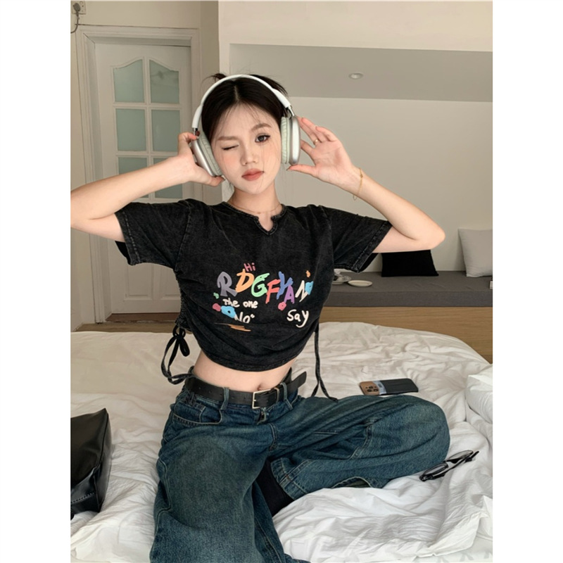 美式复古字母印花抽绳短袖T恤女装夏季做旧百搭辣妹情侣上衣
