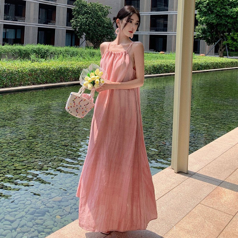 海边度假粉色无袖吊带连衣裙宽松慵懒风年夏季新款甜辣裙子女