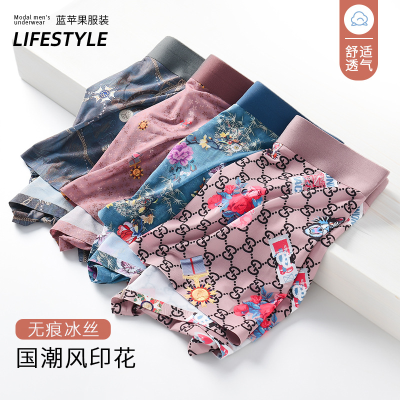 年春夏冰丝印花男士平角裤无感四角内裤国潮风冰丝无痕内裤男