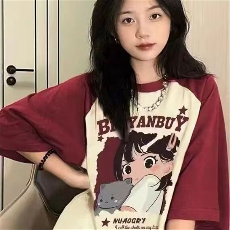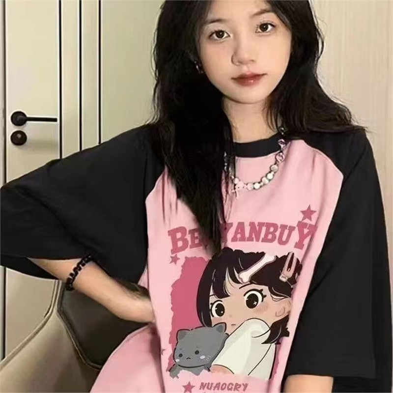 200斤高级感纯棉美式插肩短袖t恤女夏季拼色大码胖mm半袖上衣服