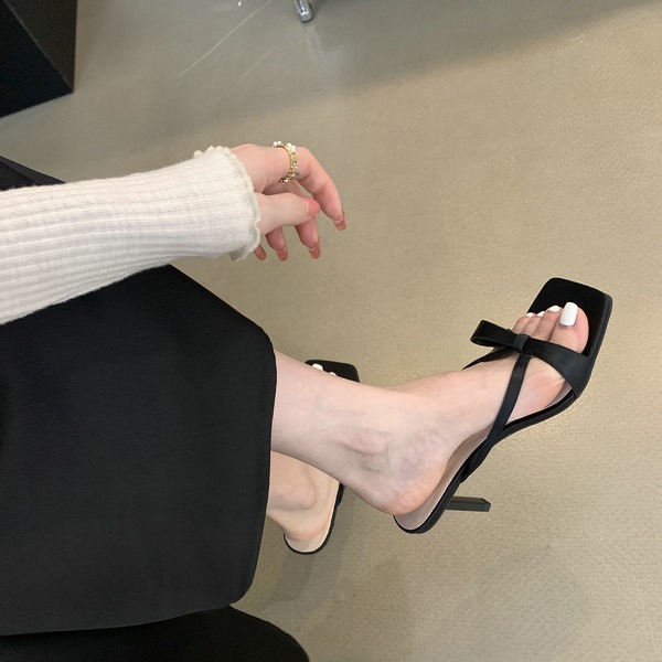 原创设计~蝴蝶结细带露趾高跟凉拖鞋女夏外穿方头仙女细跟穆勒鞋
