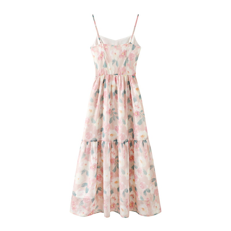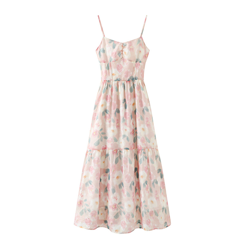 油画碎花连衣裙24年夏新款浪漫吊带连衣裙显瘦收腰长裙