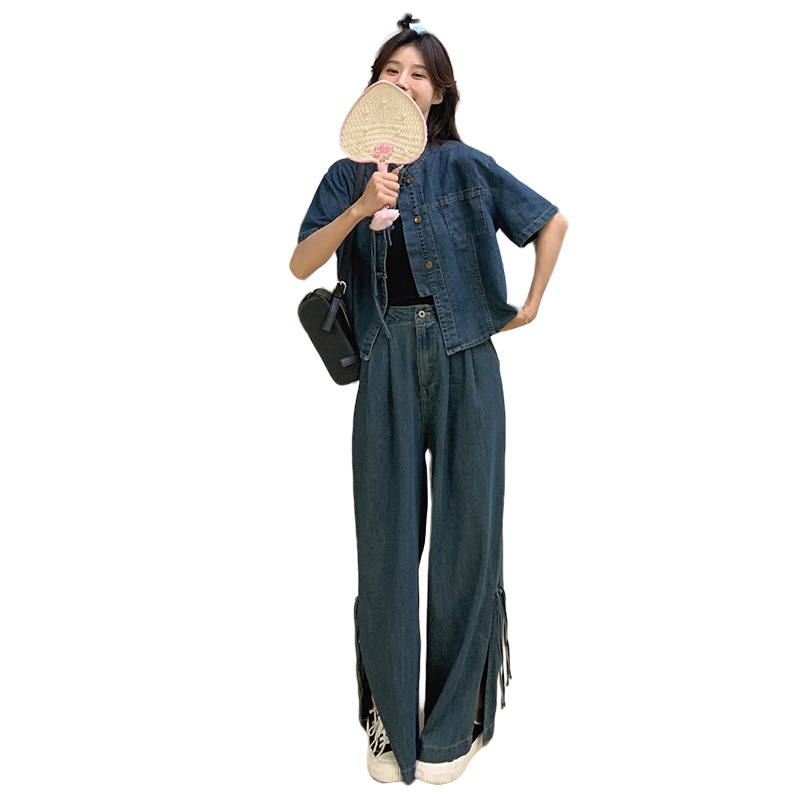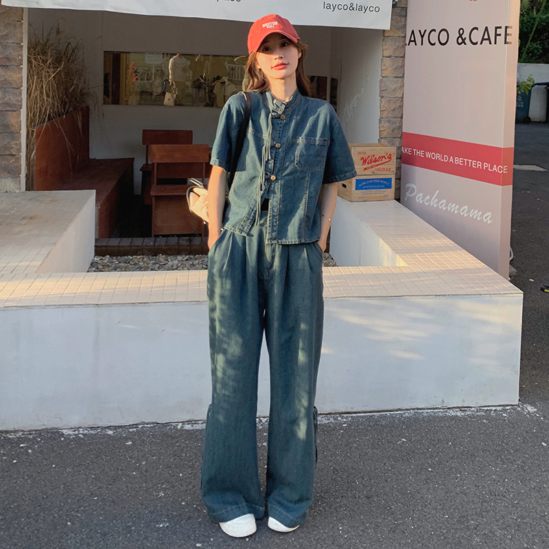 新中式国风盘扣牛仔套装女夏季新款休闲短袖衬衫阔腿裤两件套