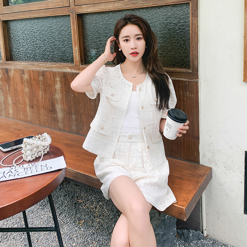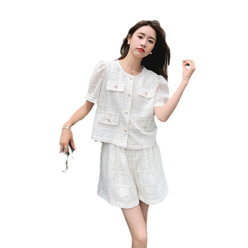 复古优雅绣花纯色小香风套装设计感蕾丝提花短款上衣宽松阔腿裤透
